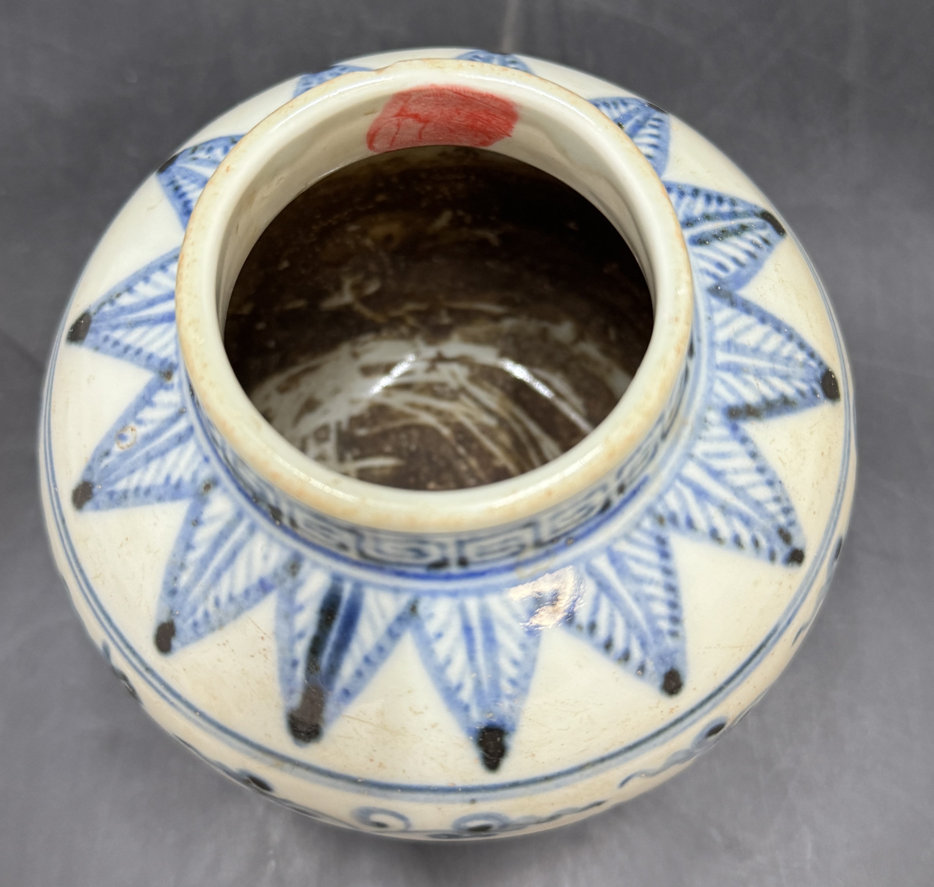 此罐胎质坚实,釉面白中泛青,青花发色沉郁古朴,尽显明晚期青花的典型风貌。器身满绘缠枝莲纹,莲花舒展、枝蔓缠绵,线条流畅灵动,似在釉面之上悠悠生长;口沿饰几何纹,底部缀莲瓣纹,多层次纹饰布局规整又富韵律,每一笔青花都凝聚着民间工匠的娴熟技艺与对吉祥寓意的美好寄望——缠枝莲“连绵不绝”的意象,是明代百姓对生活顺遂的殷切祈盼。