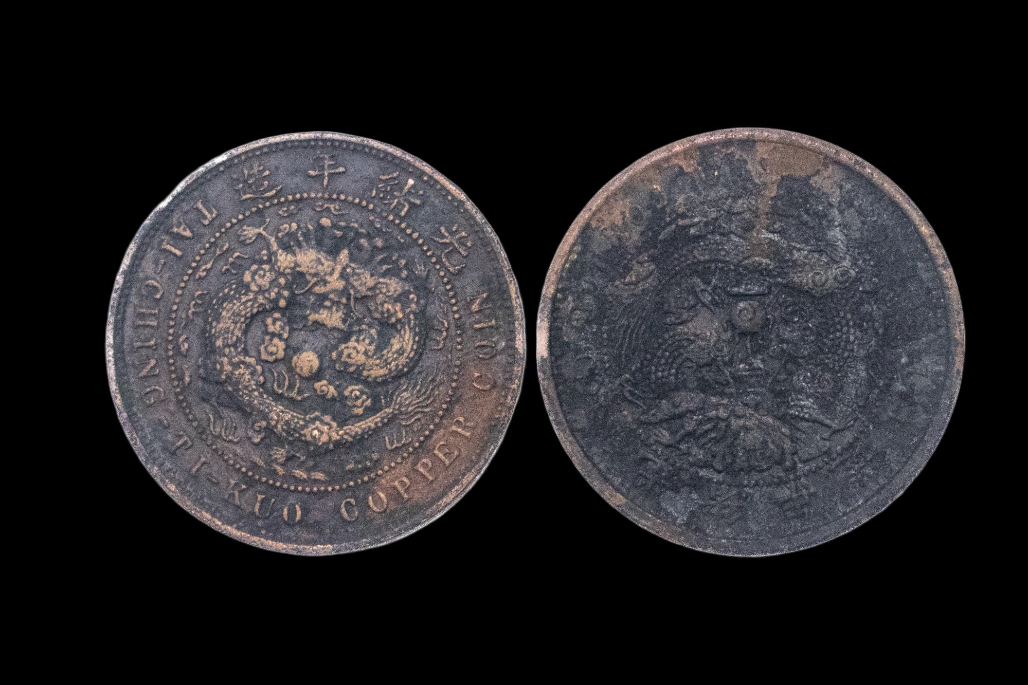 在工艺与版式特征上,两枚铜币呈现出不同的细节风貌。其一币面“大清铜币”字样端庄大气,中心“鄂”字清晰,周边纹饰规整,背面龙纹图案精美,龙身鳞片、爪牙刻画细腻,英文“TAI-CHING-TI-KUO COPPER COIN”(大清帝国铜币)字样清晰,体现了中西铸币文化的融合;另一枚虽因岁月侵蚀稍显斑驳,但仍可辨“大清铜币”的版式风格,龙纹虽模糊却不失威严,包浆厚重古朴,尽显历史沧桑感。二者版式的差异,也反映了清末铜元铸造中因模具、批次不同而产生的版别多样性,为研究大清铜币鄂字版的版别体系提供了实物参考。