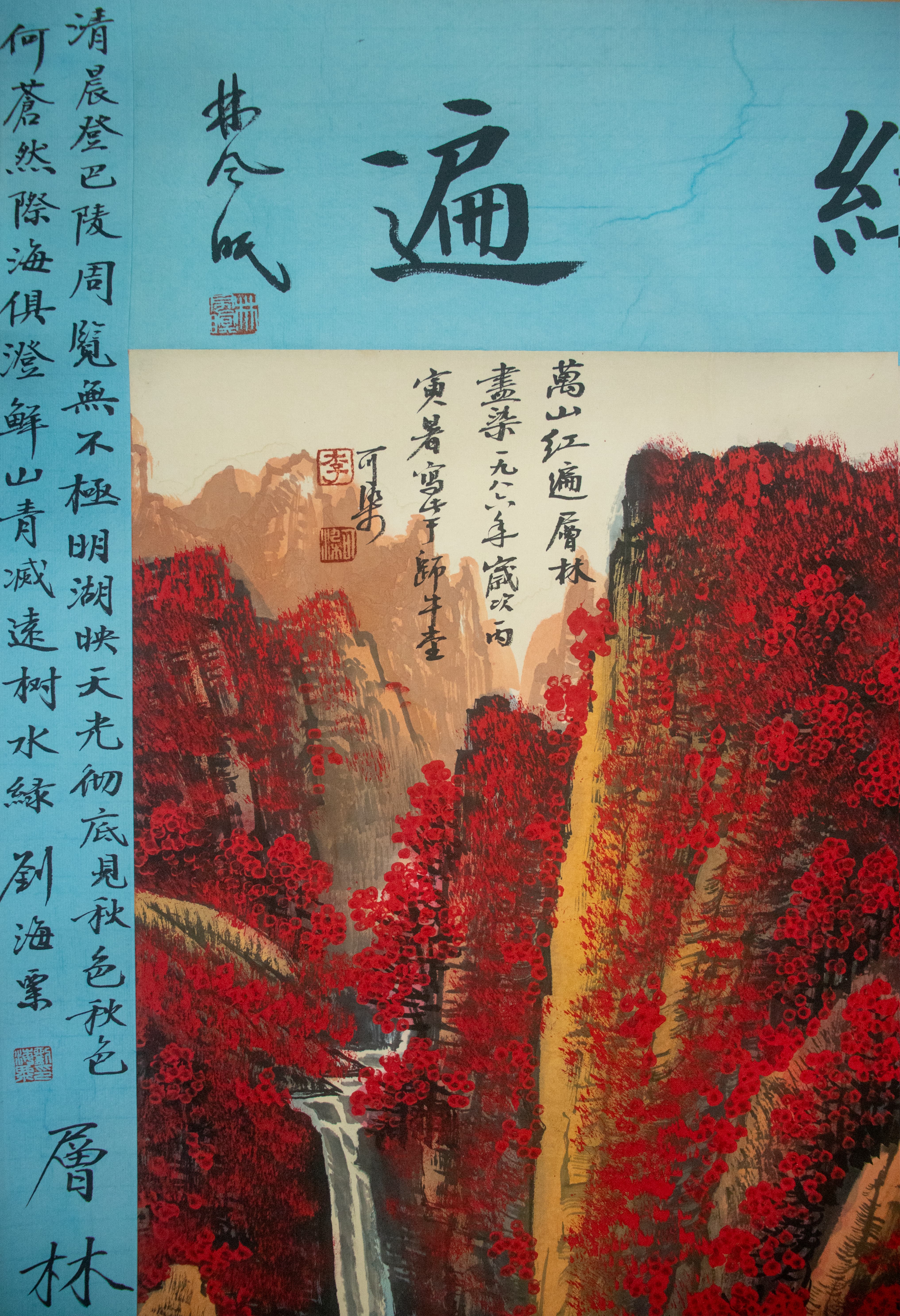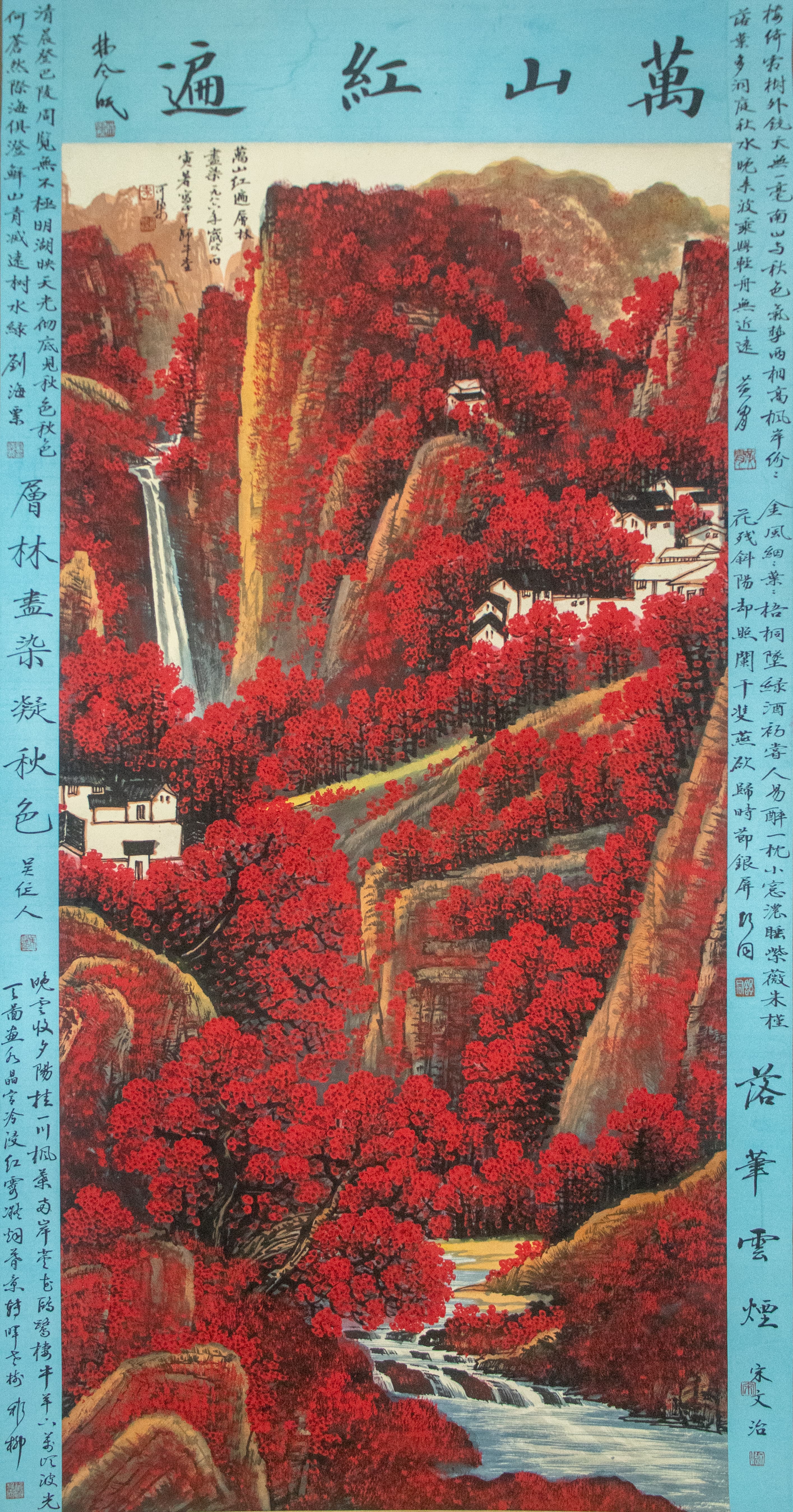 仅朱砂的运用就需“斤斤计较”,每一层敷色都要待前一层干透后再进行,耗时数月方成。画面中,瀑布的飞白、村落的素净与红叶的浓烈形成强烈对比,让“万山红遍”的视觉冲击与“可游可居”的传统意境完美融合,是现代山水画技法的标杆之作。