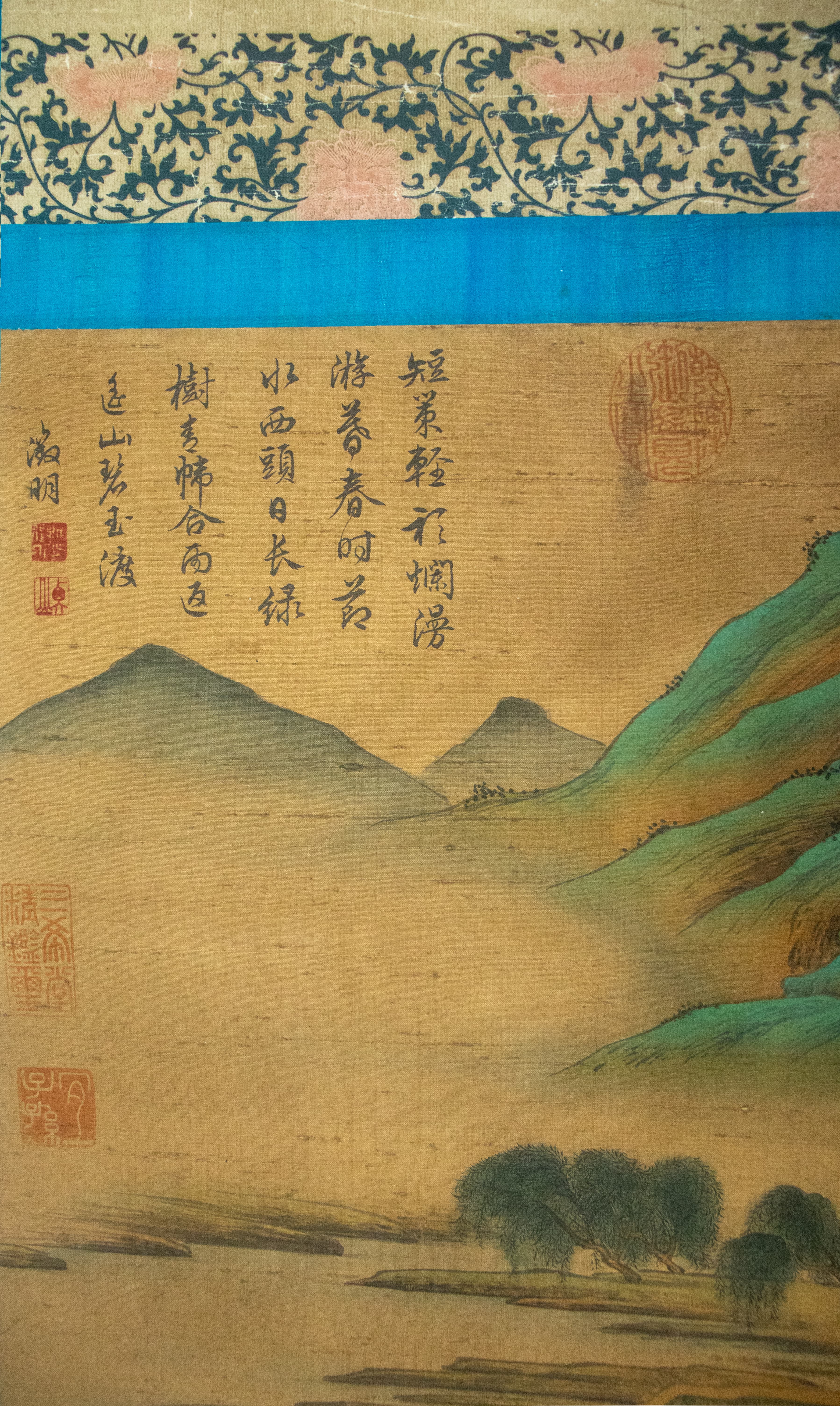 古绢的保存难度远高于纸本,能完整留存至今且设色未衰的作品极为罕见,这幅作品的材质本身就是岁月沉淀的珍贵见证;石青、石绿等矿物颜料的运用,不仅让色彩具有“千年不褪”的稳定性,更赋予画面宝石般的质感。山峦的青绿渐变、树木的浓淡层次,都是画师对矿物颜料特性的极致掌控,体现了明代青绿山水工艺的最高水准;