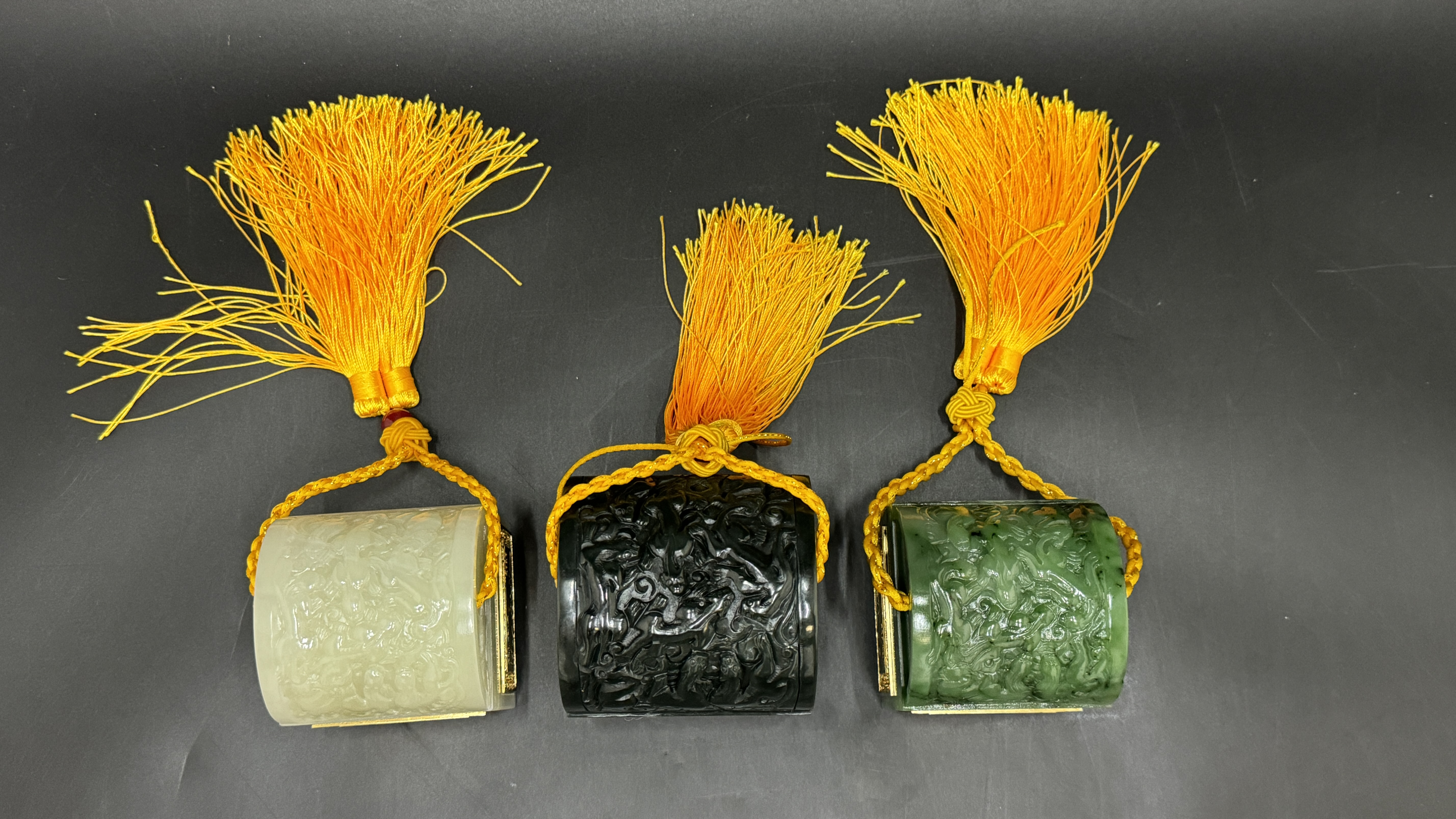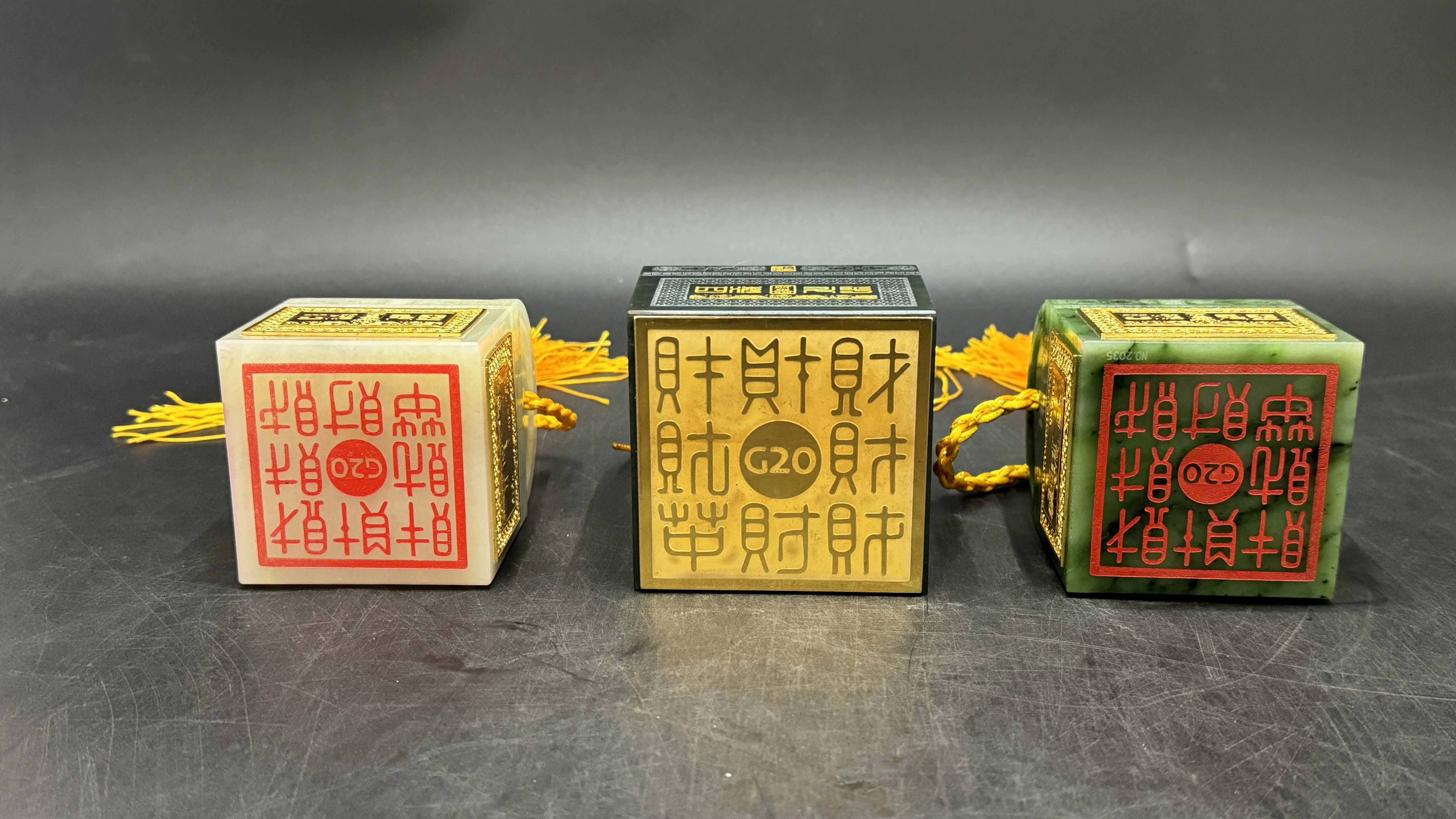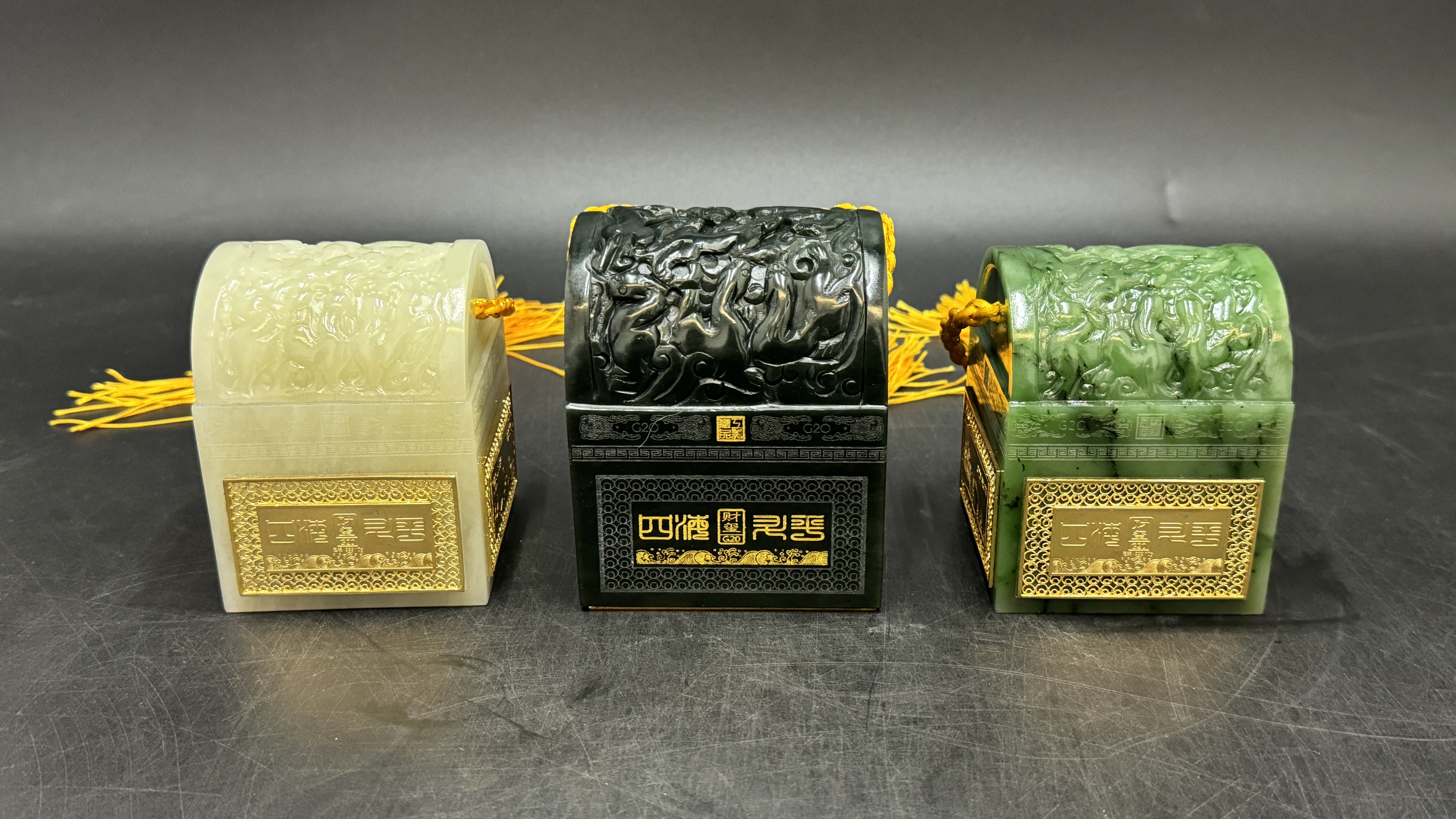 《四海升平・财玺》是一套颇具特色的玉玺藏品,承载着深厚文化内涵。它由三款不同玉质的玉玺组成,从左至右疑似采用白玉、墨玉、碧玉。白玉温润细腻、色泽纯净;墨玉漆黑致密,尽显沉稳;碧玉鲜绿通透,充满生机,玉料皆质地优良,展天然玉石之美。