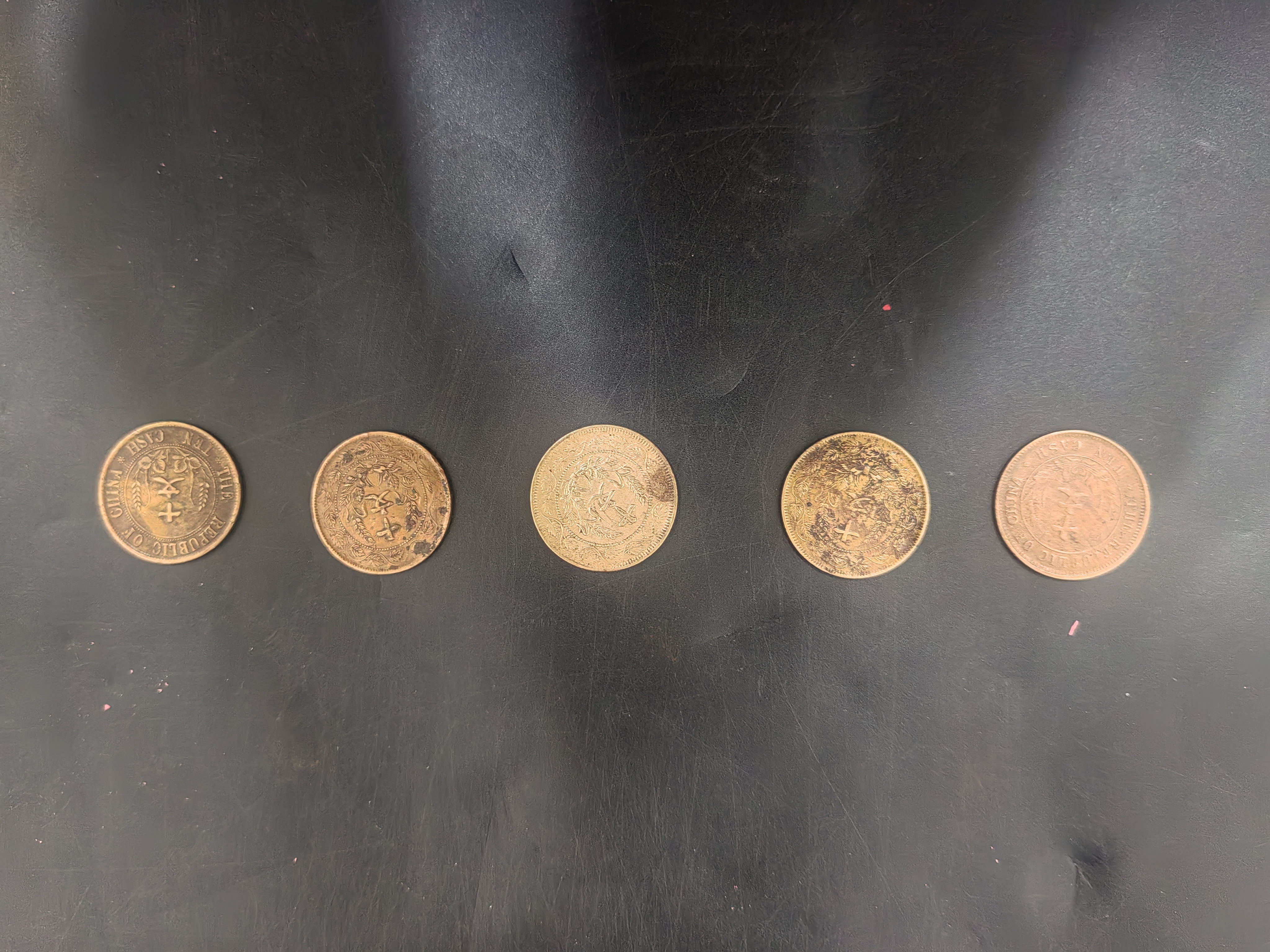 主要材质为铜,因保存环境、时间等因素,各枚钱币呈现出不同的色泽和包浆状态。有的表面呈棕红色,光泽温润,包浆较为均匀;有的则带有深浅不一的黄褐色锈迹,显示出岁月的痕迹;还有的在黄褐色基调上,夹杂着些许黑色氧化层,增添了历史沧桑感。均为圆形无孔,直径和厚度大致相同,属于当时十文铜元的常见规格。边道虽历经岁月,但仍能看出较为规整,体现了当时的铸造工艺水平。