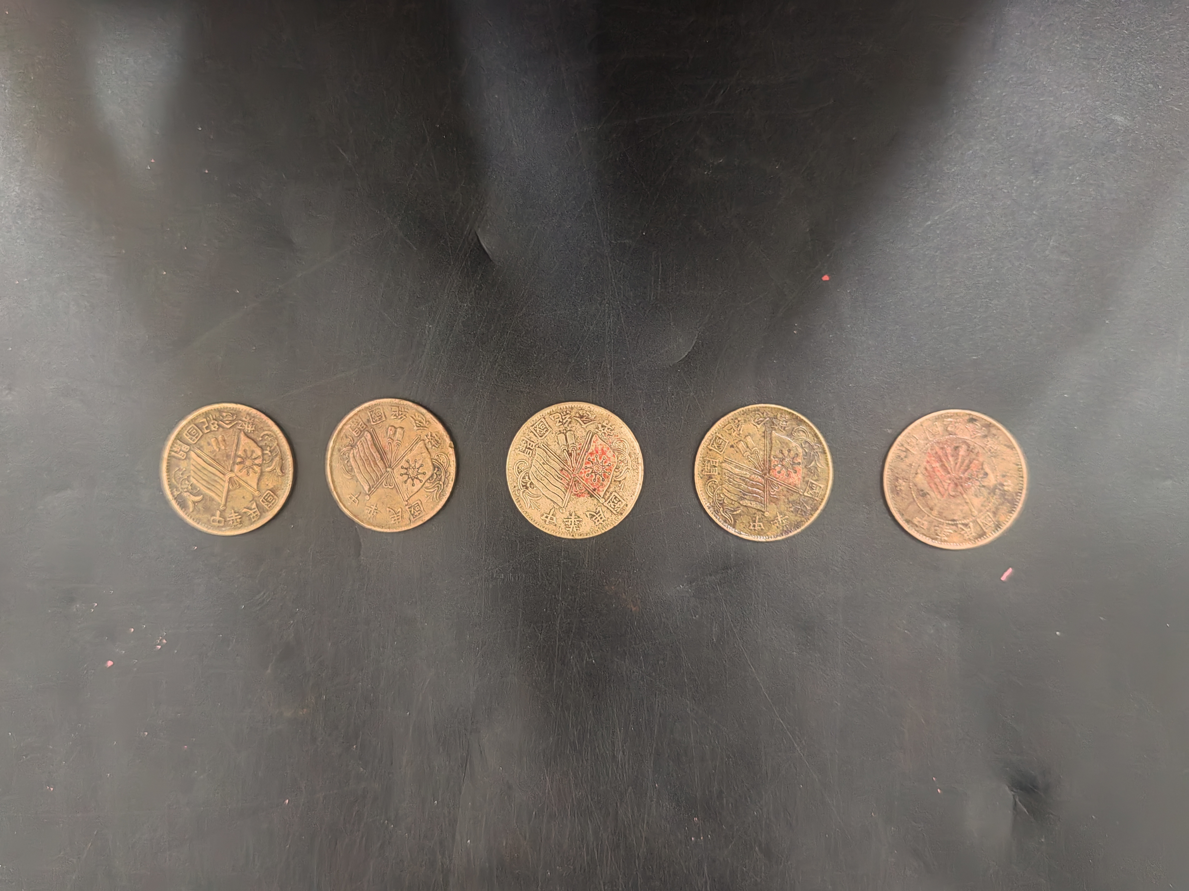 双旗币开国纪念币存世量相对较大,但像这组保存状态、版别组合等具有一定特色的藏品,仍受到收藏爱好者的关注。不同版别的双旗币,其价值有所差异,例如某些特殊字体、图案细节或铸造工艺的版本会更具收藏价值。此外,这组钱币整体的品相状态(包括磨损程度、包浆完整性等)也会影响其在收藏市场上的价格,对于钱币收藏爱好者来说,具有一定的收藏和研究价值。