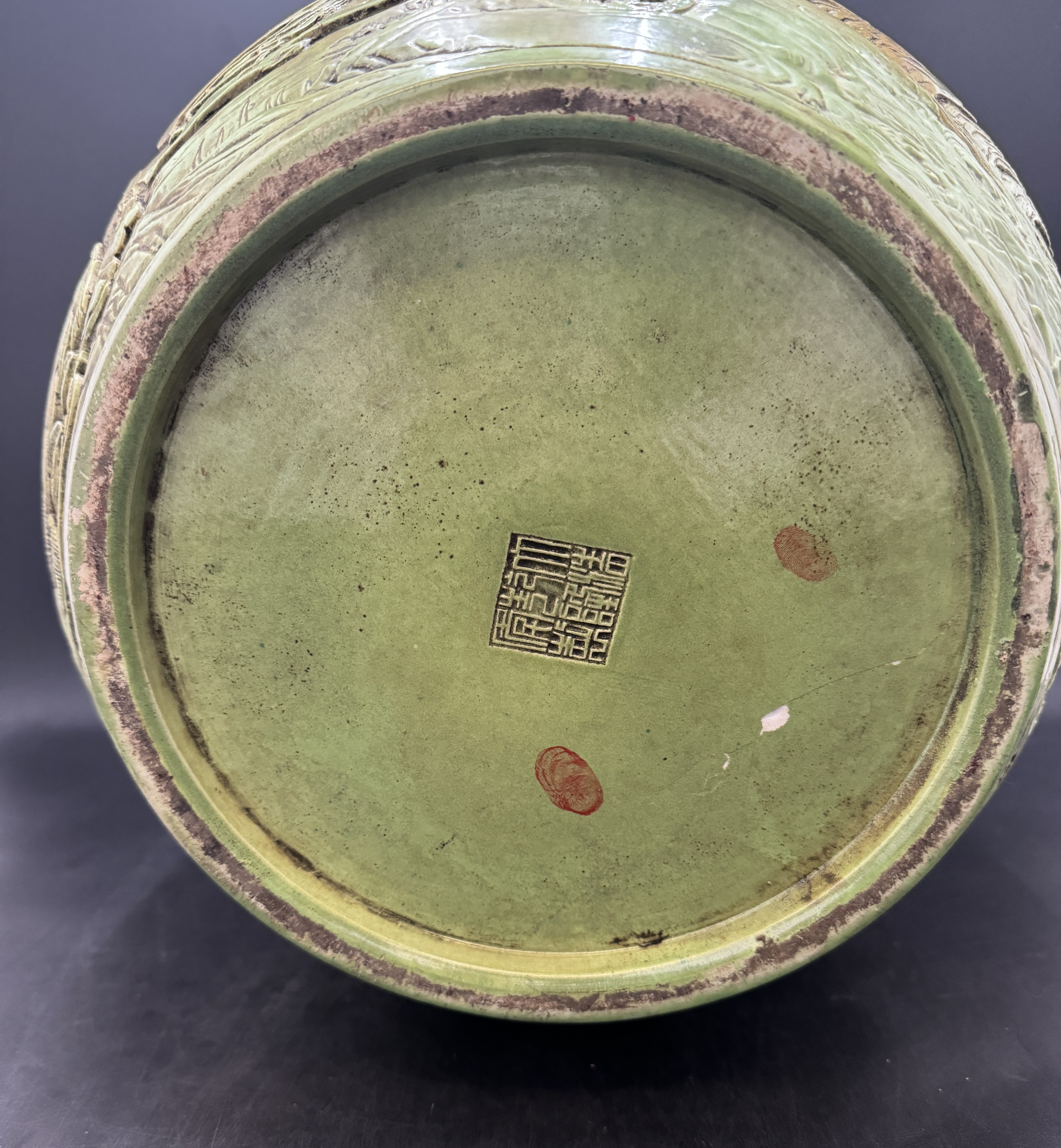 在清代瓷器的艺术长卷中,这件浮雕罗汉纹画缸无疑是一方极具禅意与工艺价值的瑰宝。它以41cm的口沿直径阔然铺展,33.7cm的器身高耸而立,在形制上便尽显大气端庄,是清代文房与陈设器具中难得的精品。