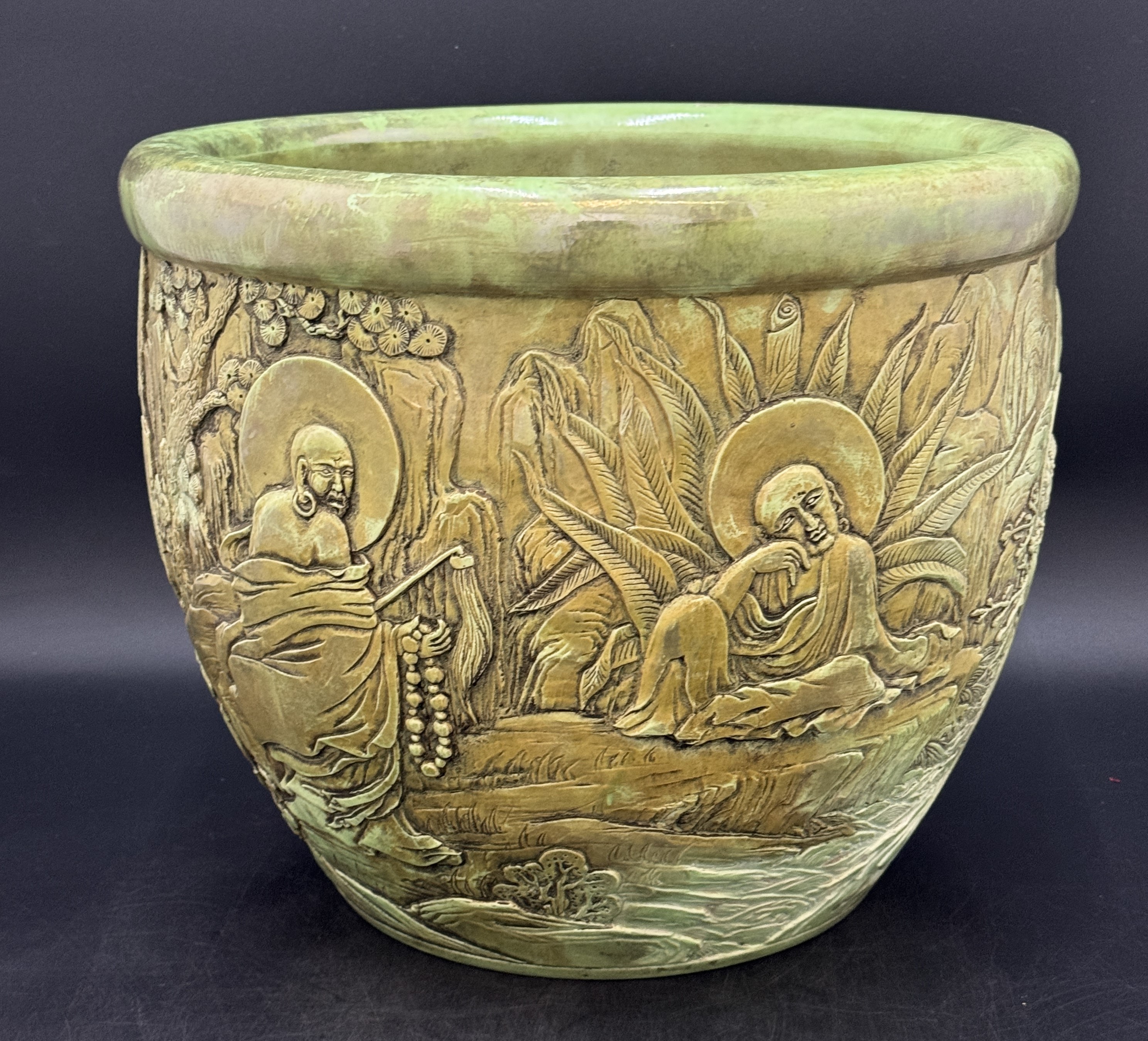 在功能与文化寓意上,画缸可储卷轴、纳书画,是文房里的实用雅器;而罗汉题材的加持,又让它兼具宗教祈福的内涵,成为清代文人与信众精神世界的物质载体。它将陶瓷工艺的精湛、佛教文化的深邃与文人审美的雅致融为一体,既是清代制瓷技艺的生动体现,也是一段禅意岁月的具象留存,于今时今日,仍以其厚重的历史感与艺术感,叩击着收藏者与艺术爱好者的心扉。