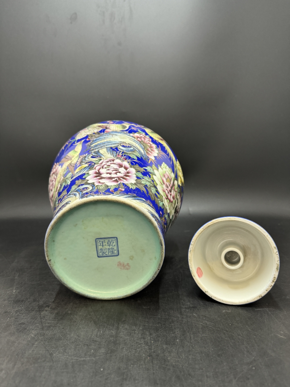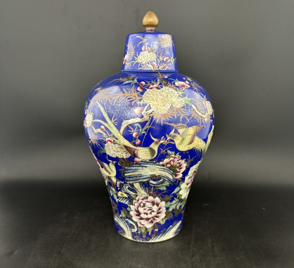 在蓝色的釉面上,运用珐琅彩工艺绘制了精美的龙凤纹以及花卉、竹桃等纹饰。龙凤纹饰栩栩如生,龙身姿矫健,鳞片细密,龙须飘动,尽显威严霸气;凤凰羽毛色彩斑斓,尾羽舒展,姿态优雅,与龙相互映衬,寓意龙凤呈祥,彰显出吉祥富贵的美好愿景。花卉纹饰包括牡丹、桃花等,牡丹花朵硕大饱满,花瓣层次丰富,色彩粉嫩,尽显雍容华贵;桃花点缀其间,粉嫩的花朵与翠绿的枝叶相互映衬,充满生机与活力。