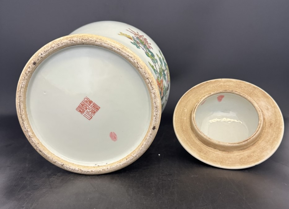 罐底施白釉,中心可见红色印章款识,虽具体文字不够清晰,但这种款识是判断瓷器年代和制作者的重要依据之一。