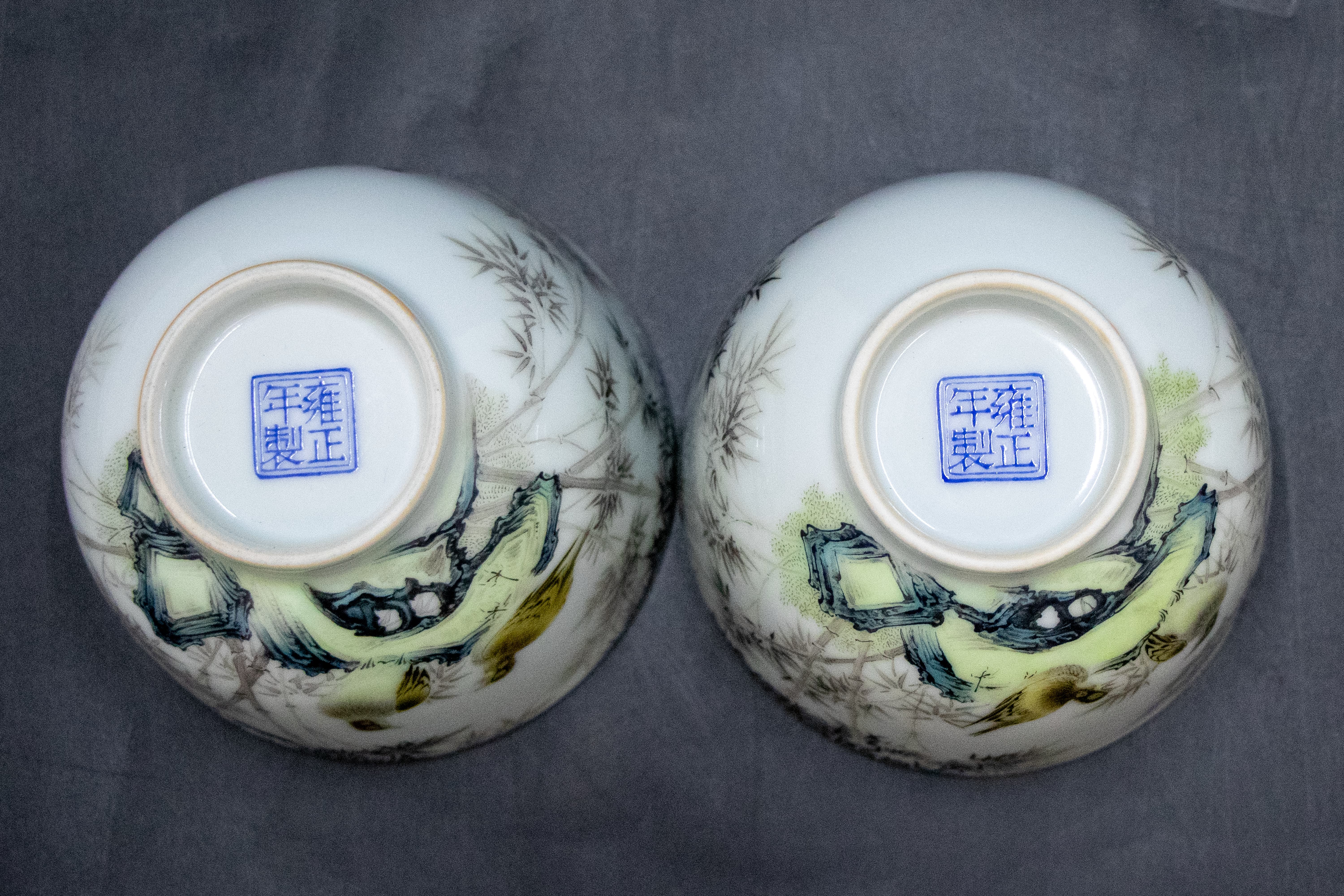 杯底清晰可见 “雍正年制” 四字款识,是其出身雍正官窑的有力证明。历经岁月流转,这对竹节杯依然保存完好,珐琅彩色彩鲜艳亮丽,毫无褪色迹象,足见其工艺之精湛与品质之卓越。