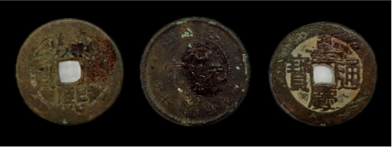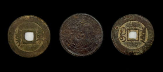 这是康熙通宝背“东”、嘉庆通宝、安徽省造光绪元宝每元当制钱十文为一组的清代古钱币。