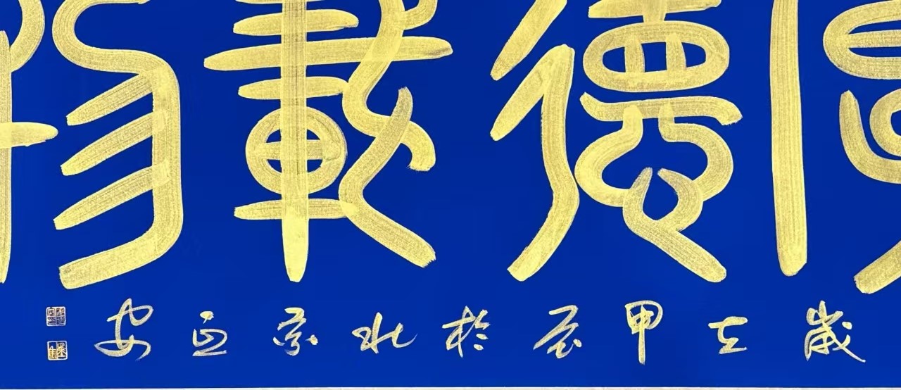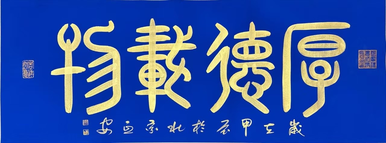 这幅“厚德载物”书法作品,尽显姚延安先生的艺术造诣与精神气象:以宝石蓝为底、泥金作书,色彩对比强烈而华贵,视觉冲击力十足。字体取篆书意趣,线条圆浑遒劲,笔画流转间既见传统篆法的端庄古雅,又融入个人笔墨的灵动气韵——每一笔的提按顿挫皆饱含力量,结构布局疏密得当,将“厚德载物”所蕴含的包容、厚重之精神,通过笔墨形态具象化呈现。