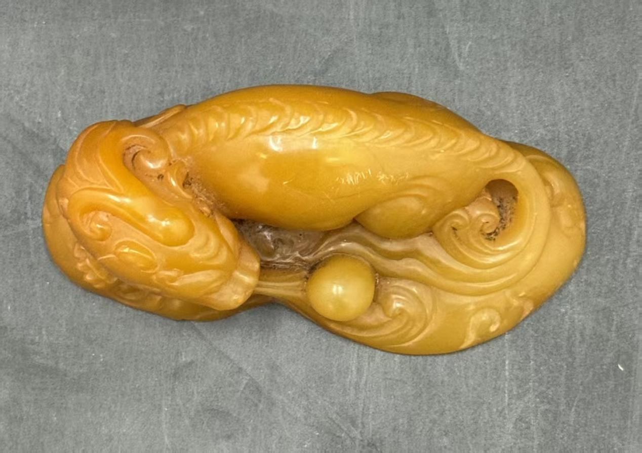 其工,属清代雕刻精工。瑞兽造型雄健灵动,兽首威严,鬃毛卷曲如浪,身姿伏卧含势。周身云纹环绕,瑞兽戏珠,寓意“祥龙献瑞,珠兆吉祥”。刀工流畅自然,细节处见功力,将瑞兽神韵、云纹飘逸刻画得淋漓尽致。其韵,是历史与文化的交融。它诞生于清代金石篆刻、文房清供盛行的时代,曾见证案头笔走龙蛇,承载藏家雅趣。雕刻艺术在清代的璀璨结晶,每一丝重量都在诉说石中帝王的千年故事。