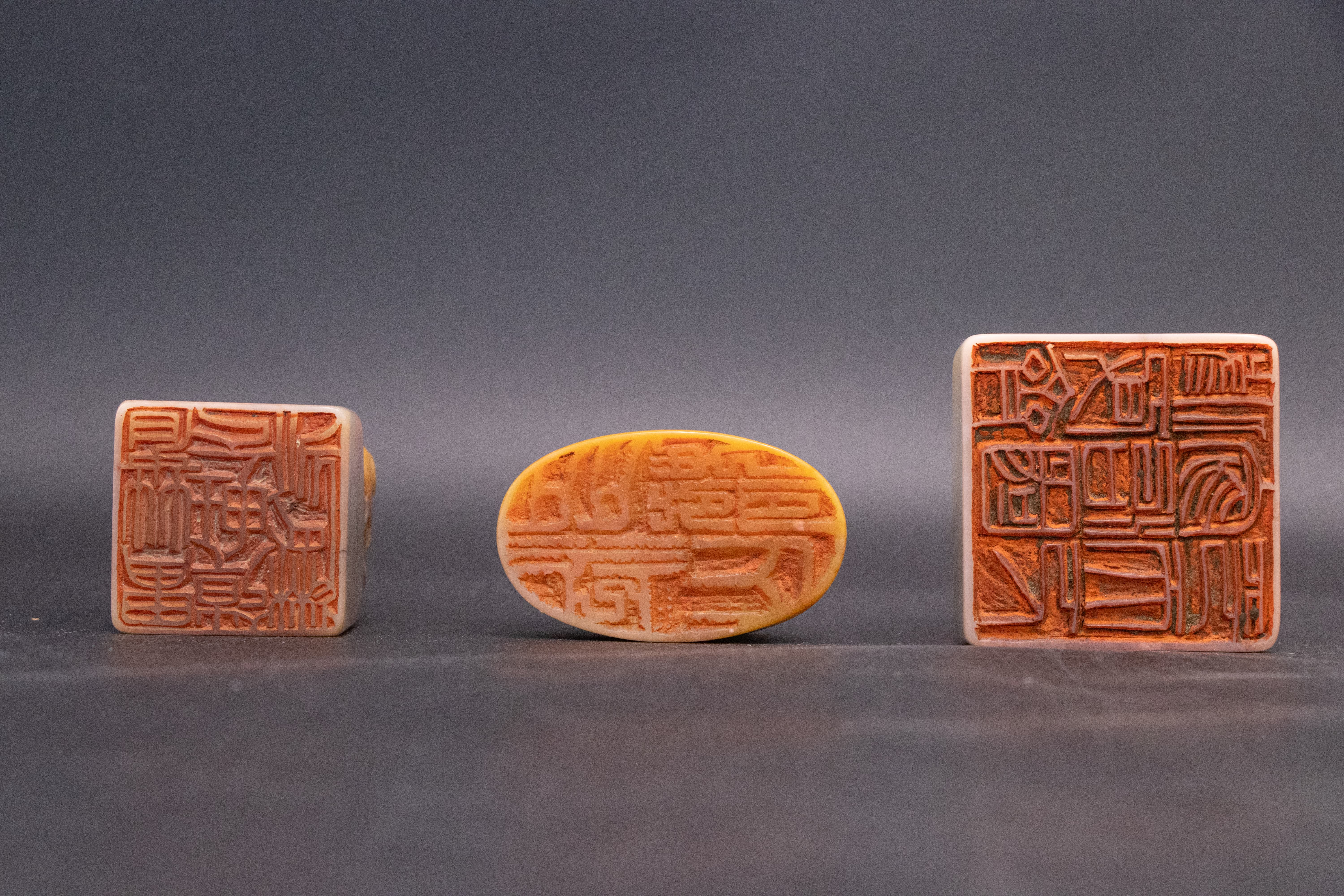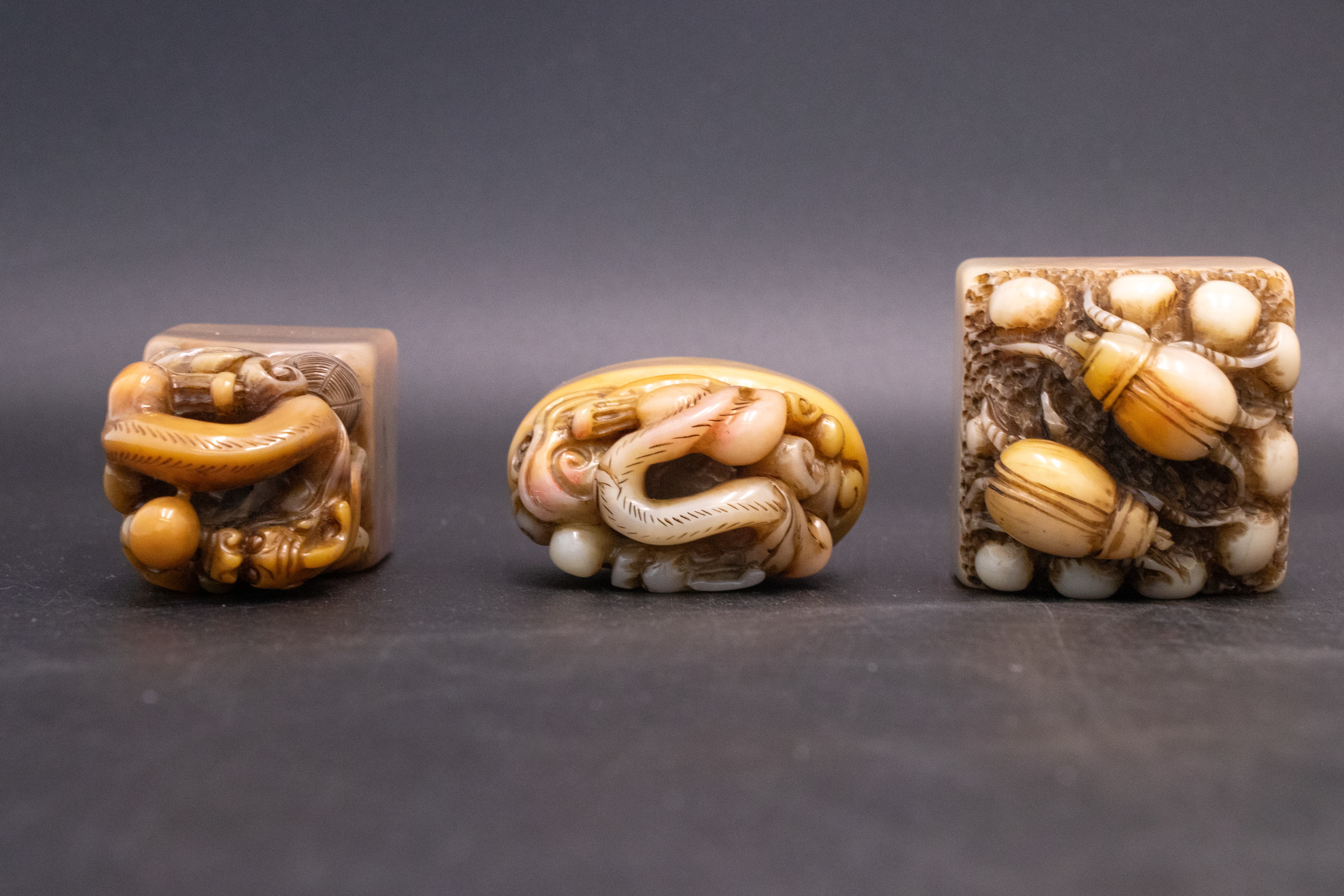 三方印章均取材于寿山芙蓉石,该石质地细腻如脂,色泽淡雅纯净,或呈鹅黄、或显乳白,肌理中隐含天然的温润光泽,上手抚之,手感凝嫩柔滑,尽显“石中君子”的典雅气质。芙蓉石的色泽过渡自然,在雕刻艺人的巧思下,石材的天然纹理与色彩被巧妙利用,为印章的钮饰与印面增添了独特的视觉层次,是寿山石中兼具观赏性与实用性的上乘之选。