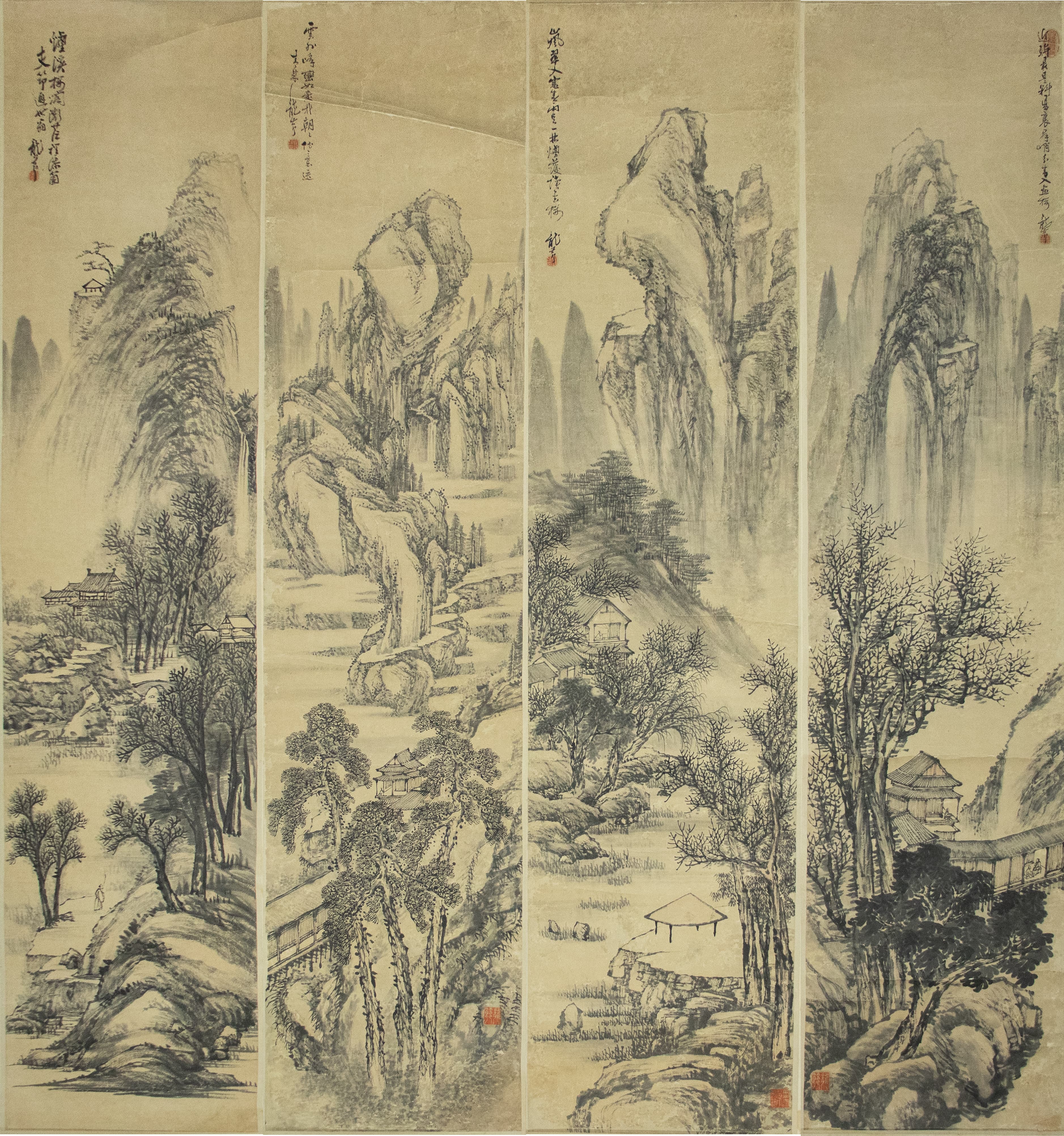 这是一组极具艺术价值的金龙节《山水四条屏》国画作品。作品以传统水墨技法绘制于泛黄的宣纸上,呈现出四幅独立又连贯的山水图景。每幅画面中山石造型各异,或巍峨高耸,或怪石嶙峋,通过皴法的巧妙运用,展现出山石的纹理与质感,墨色浓淡层次丰富,营造出深远的空间感。山间树木姿态万千,有的枝繁叶茂,有的枯瘦遒劲,与山石相互映衬,增添了画面的生机与野趣。画面中还点缀着亭台楼阁、小径行人,虽笔触简练却意趣盎然,体现出文人山水 “可居可游” 的意境。