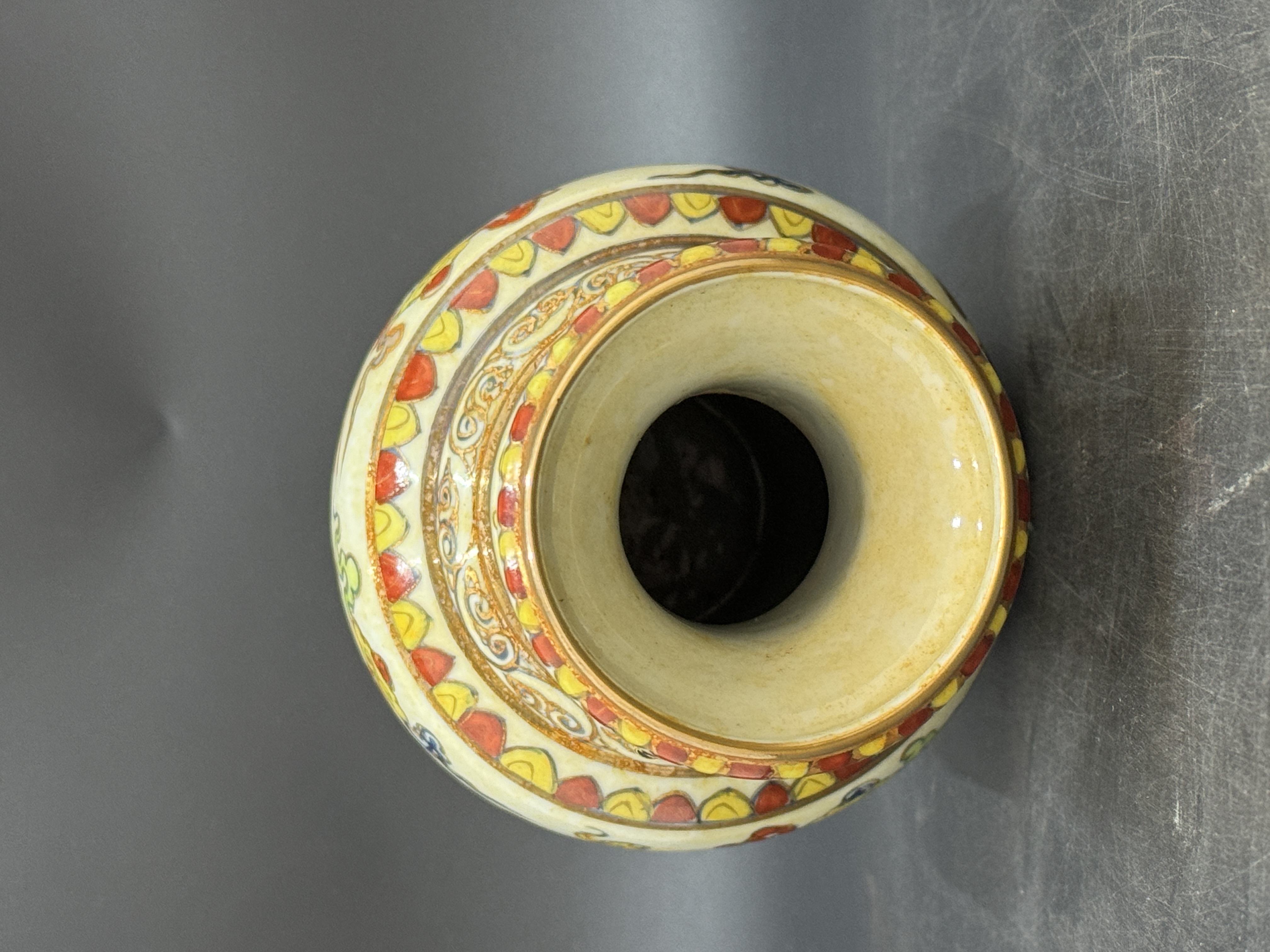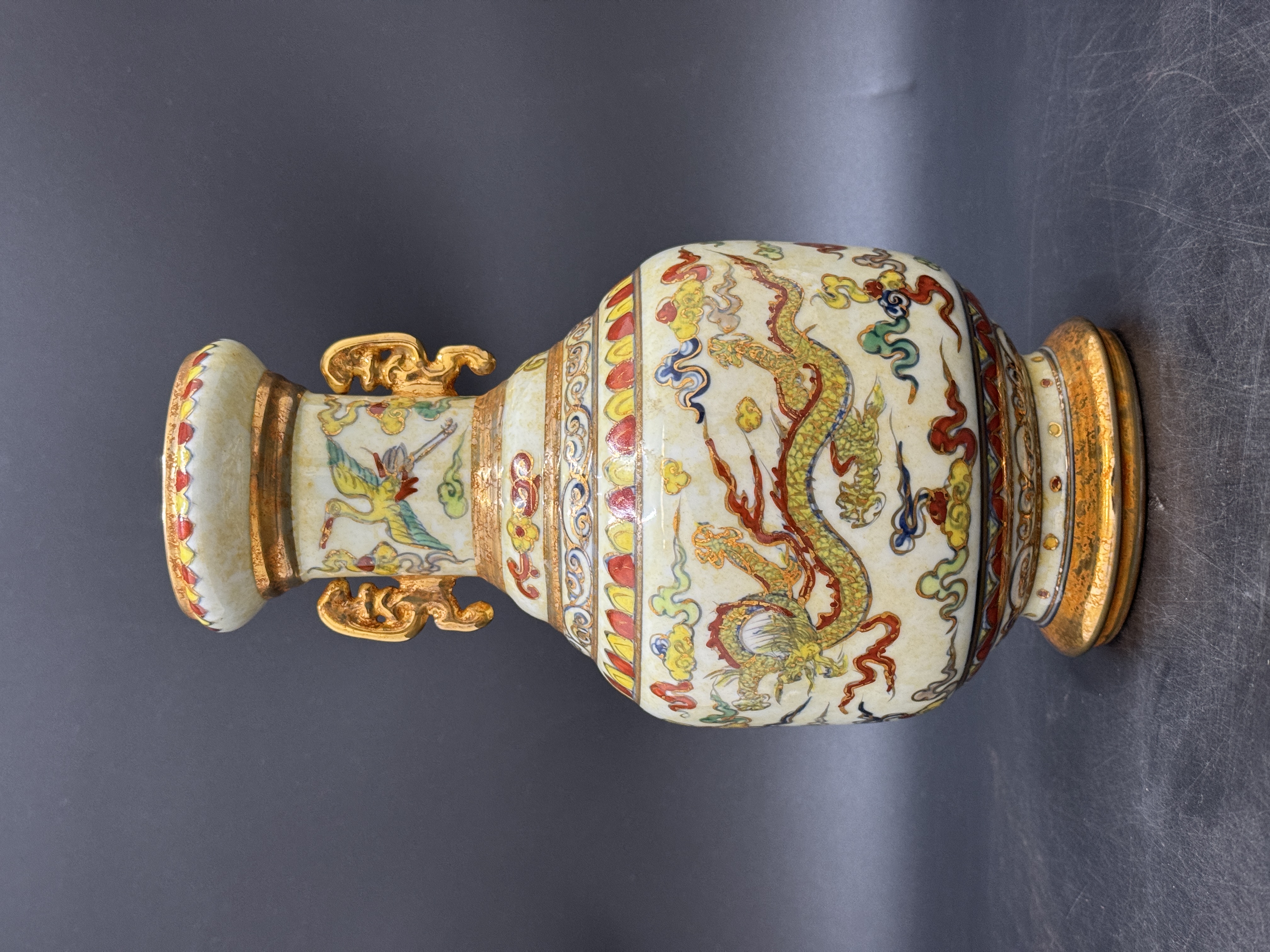 大明成化年间,御窑厂集天下瓷艺之精,铸就此件斗彩龙纹双耳瓶。它承载着成化帝对瓷艺的极致追求,是明代宫廷御瓷的巅峰之作,更是中国陶瓷史上的璀璨明珠。斗彩工艺需经釉下青花与釉上彩料两次烧制,色彩交融间,尽显皇家御瓷的繁复工序与高超技艺。瓶身所绘金龙,身姿矫健、鳞片分明,于云间翻腾,尽显九五之尊的威仪;辅以仙鹤纹饰,“鹤寿龙年” 的吉祥寓意,更添皇家器物的祥瑞之气。