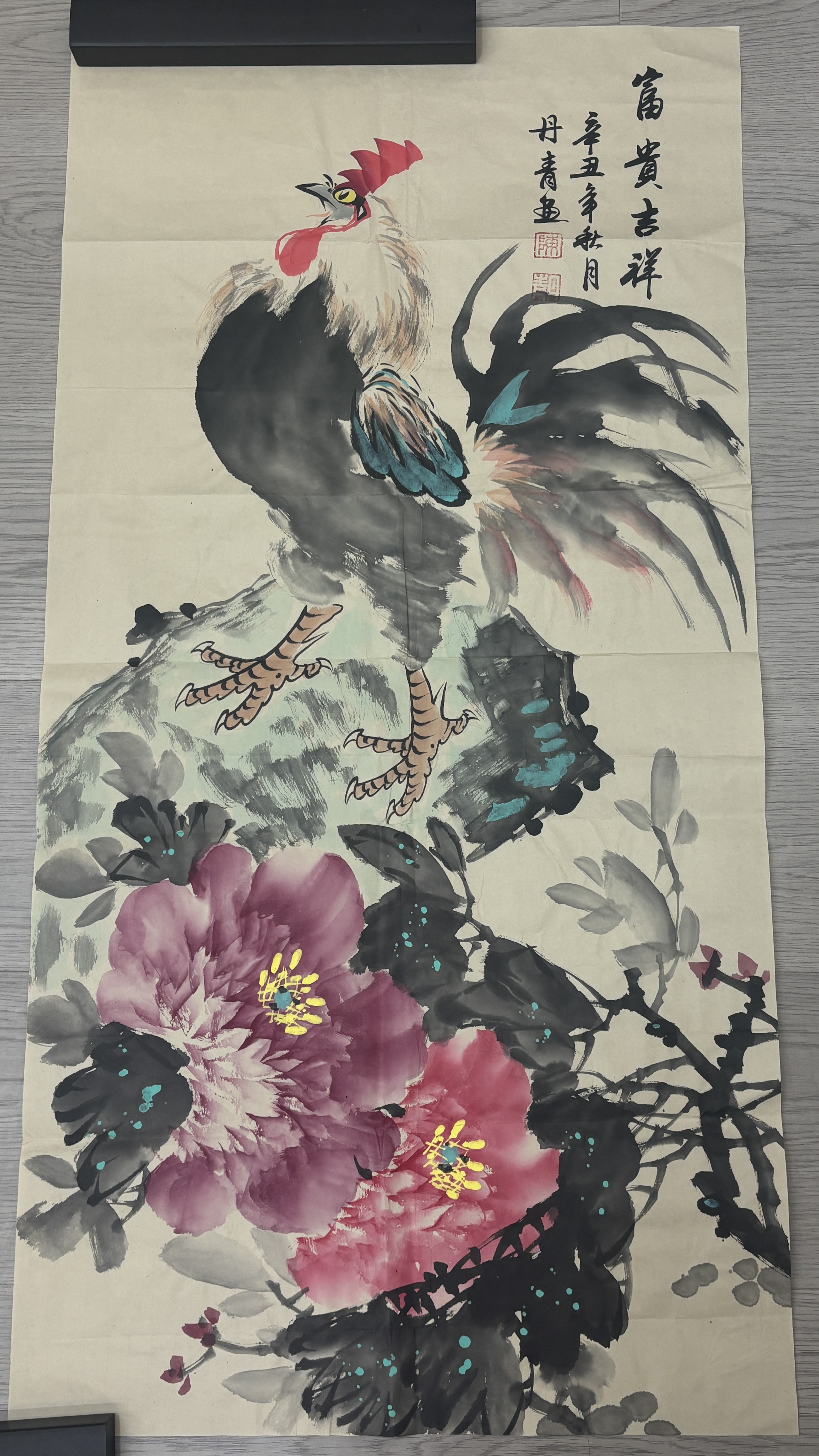画面中有一只公鸡和盛开的牡丹花。公鸡位于画面的上方,身体主要以黑色为主,鸡冠和肉垂是红色的,尾羽长而色彩斑斓,有黑色、蓝色和红色的羽毛。公鸡的姿态显得雄赳赳气昂昂,头部抬起,目光坚定,给人一种威风凛凛的感觉。