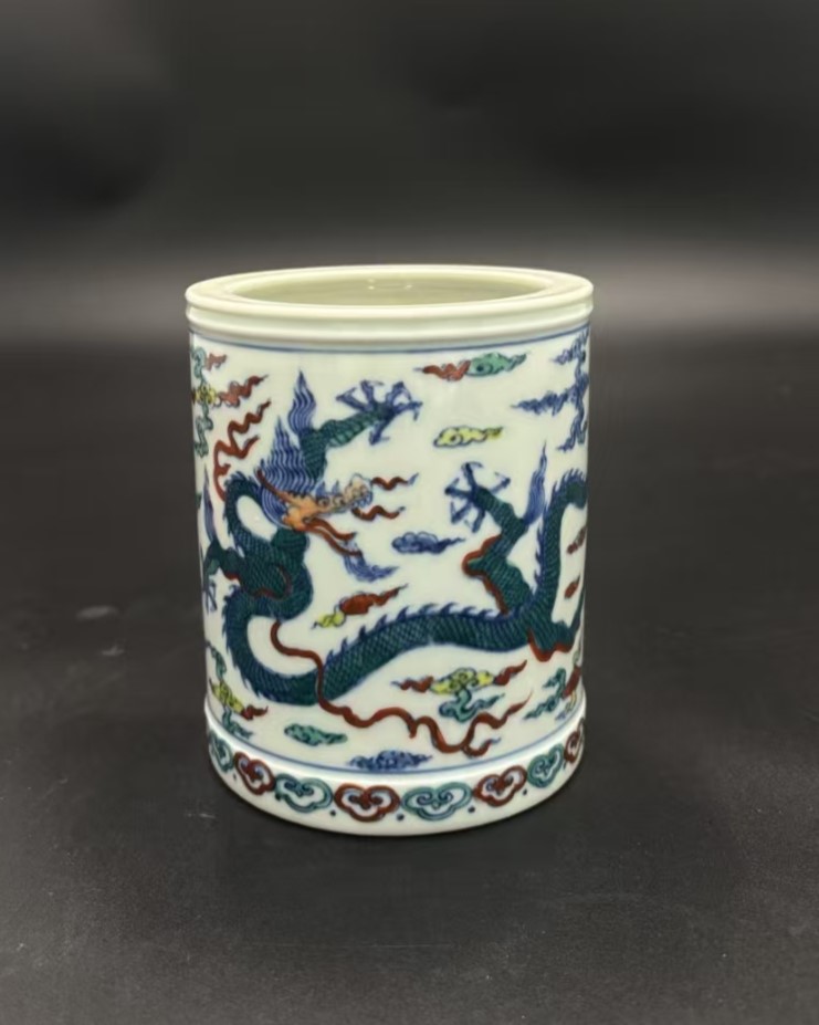 清龙纹斗彩笔筒因其精美的工艺和独特的文化内涵,成为了收藏家和历史爱好者的珍贵之物。在拍卖市场上,一些保存完好、工艺精湛的清龙纹斗彩笔筒往往能拍出高价,体现了其较高的收藏价值和市场认可度。