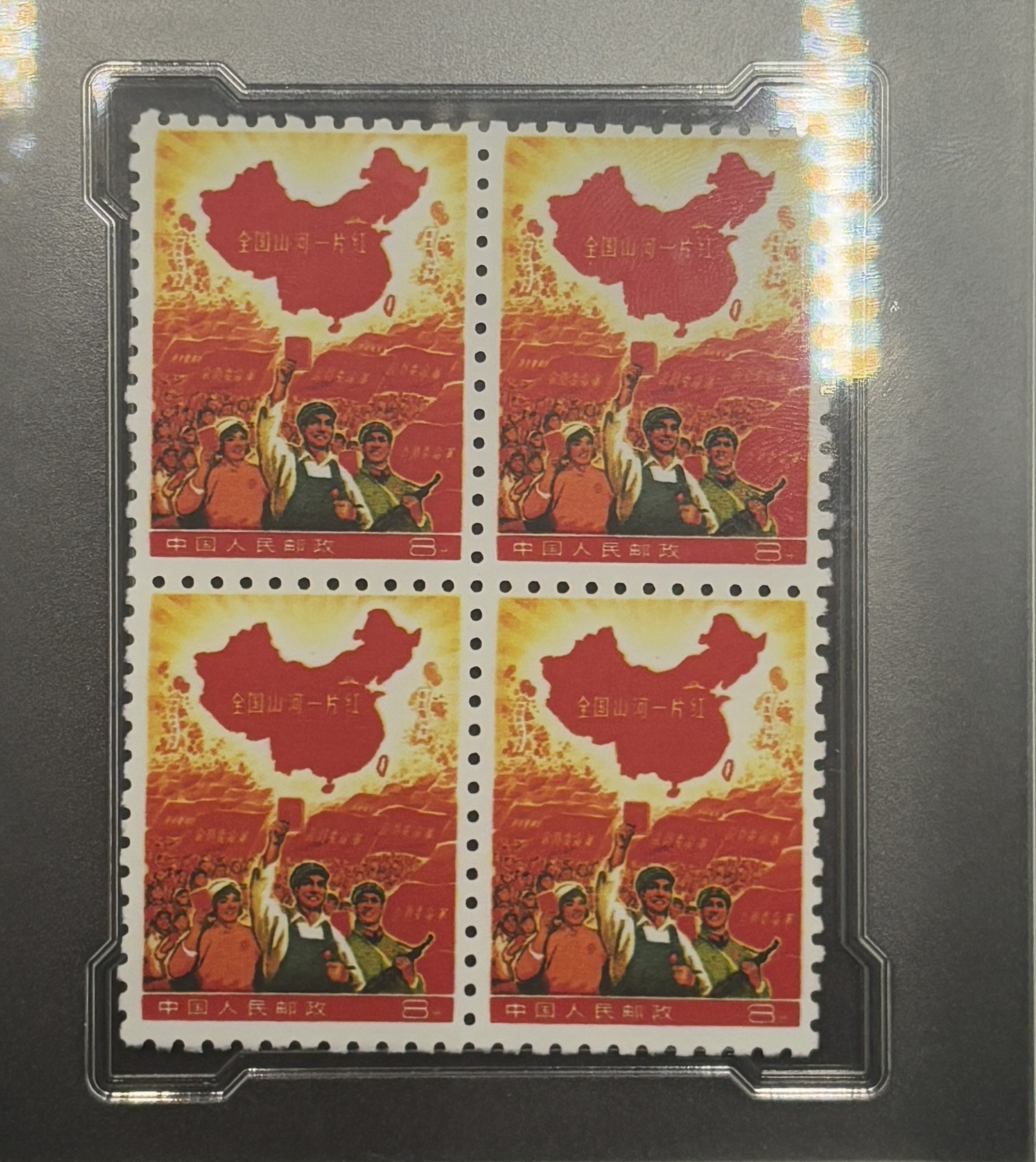 《全国山河一片红》是中华人民共和国邮电部为了庆祝全国(除台湾省外)29个省、市、自治区革命委员会的成立,而原定于1968年11月25日发行的纪念邮票。1968年11月24日,因发现票面中的中国地图绘制不准确,而被停止发行。《全国山河一片红》票面图案为工农兵手持《毛主席语录》,背景中“革命委员会”的红旗汇成的红色海洋和工农兵群众热烈欢呼的场面,上方为一幅中华人民共和国地图,地图上除台湾省外全部绘成大红色,上面印有“全国山河一片红”金字。