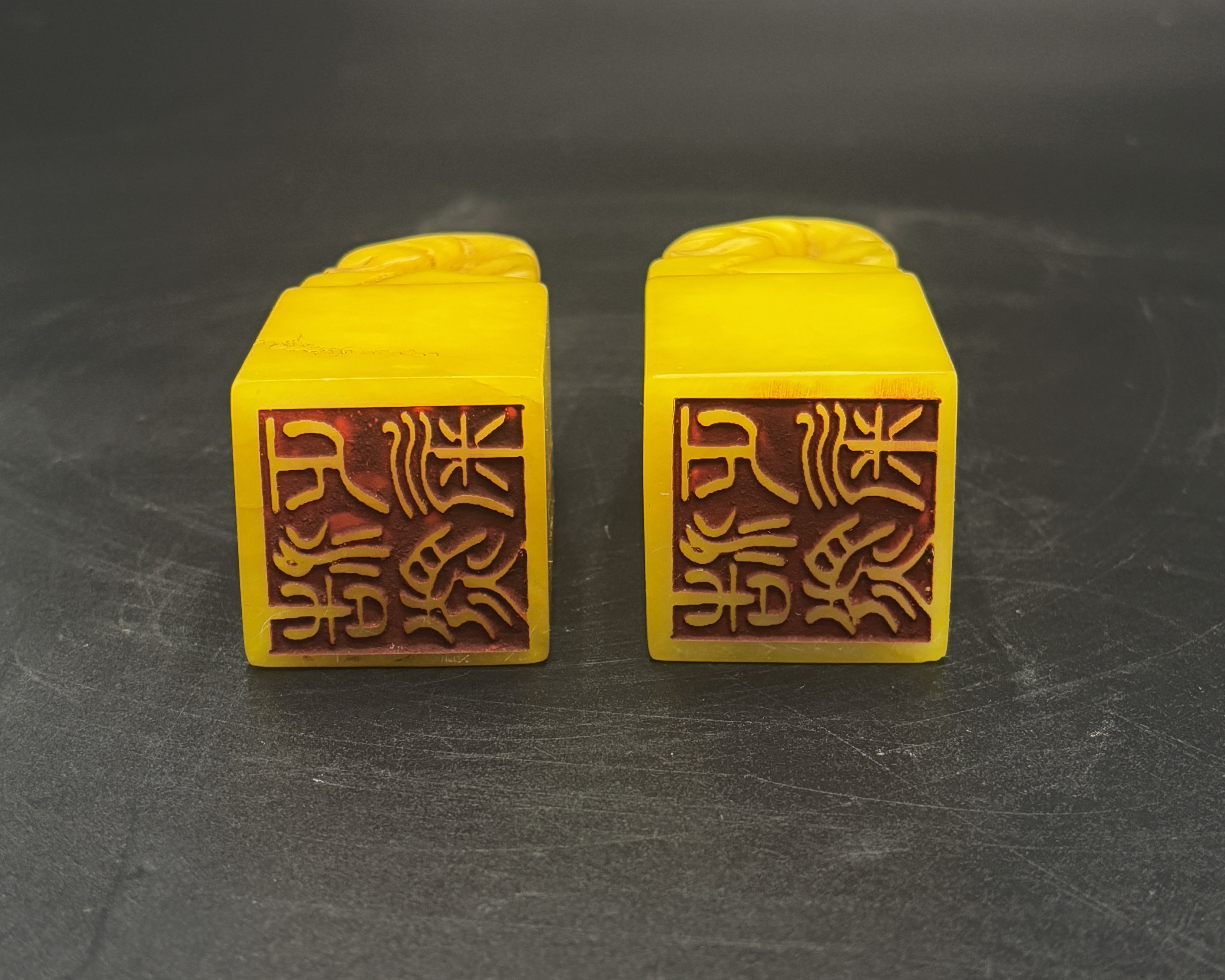 寿山石,素有 “石中之王” 的美誉,自古人便对其青睐有加,视作文房珍宝。其质地温润细腻,触之若玉,仿佛能感受到岁月的温柔抚摸。每一块寿山石都独一无二,天然的纹理与色泽,宛如大自然精心绘制的画卷,赋予了这对印章与生俱来的艺术魅力。 印章之上,瑞兽栩栩如生。它们或昂首挺胸,威风凛凛,彰显着不凡的气势;或双目炯炯,洞察四方,仿佛守护着无尽的秘密。瑞兽在传统文化里,象征着吉祥如意、福寿安康,是人们对美好生活的向往与祈愿。将其雕刻于印章之上,不仅为印章增添了神秘的文化底蕴,更赋予了它一份独特的守护力量。 清晚期的工匠们,以精湛的技艺,在这对印章上精雕细琢。刀工精美老道,线条流畅自然,每一处细节都处理得恰到好处。瑞兽的毛发根根分明,鳞片细腻入微,躯体的肌肉线条充满力量感,无不展现出工匠们对艺术的执着追求和对细节的极致把控。而印章上的刻字,更是体现了制作者在篆刻艺术上的深厚造诣,每一笔每一划都力透石背,彰显着独特的书法韵味。 这对寿山石瑞兽刻字印章,不仅是艺术的结晶,更是历史的见证。它们经历了岁月的洗礼,承载着清晚期的文化气息与艺术风格。无论是作为收藏爱好者的珍品,还是作为文房雅器的点缀,都将为您的生活增添一份独特的雅致与韵味。