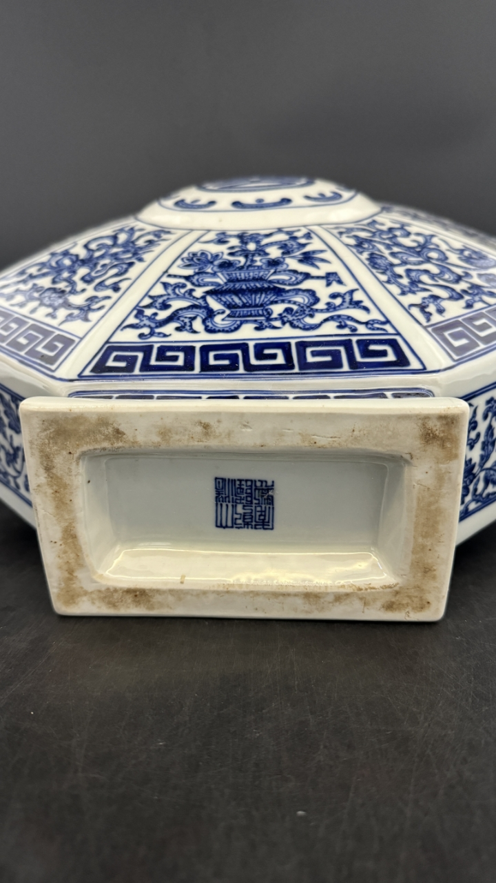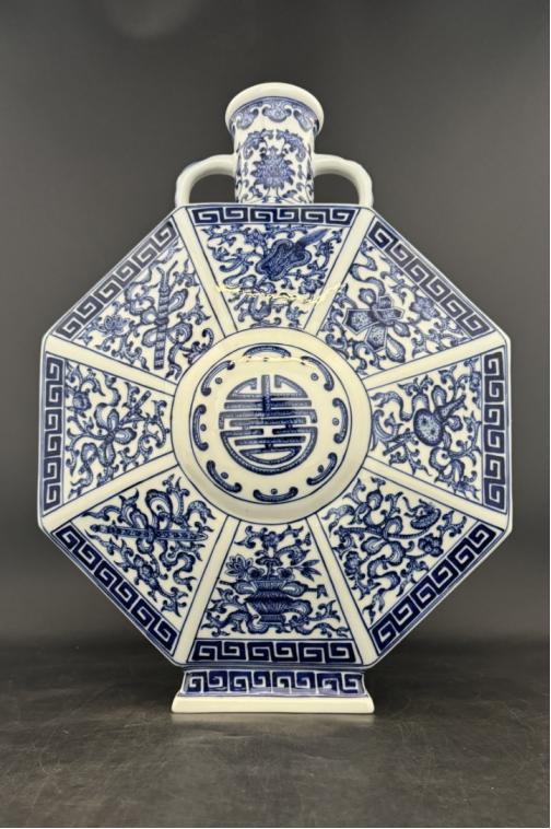 此器非普通陈设之物,实为乾隆皇帝‘礼寿治国’之象征!八方喻‘八方来朝’,贯耳通‘贯耳洪福’,寿字纹更暗合乾隆晚年追求长生与盛世永固之心境。它将帝王意志、工匠神技、民间吉祥符号熔铸一器,堪称一部用青花写就的‘盛世密码’。