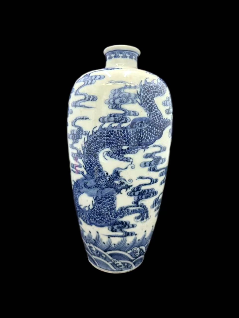 而瓶身所绘龙纹,无疑是最大亮点。矫健的巨龙蜿蜒盘旋,龙须飘逸,龙目圆睁,威严的气势扑面而来。工匠以细腻笔触勾勒出龙鳞,每一片都栩栩如生,仿佛在诉说着皇家的荣耀与威严。在中国传统文化中,龙象征着至高无上的权力与祥瑞,这件梅瓶承载着深厚的文化内涵,是康熙盛世的生动写照。