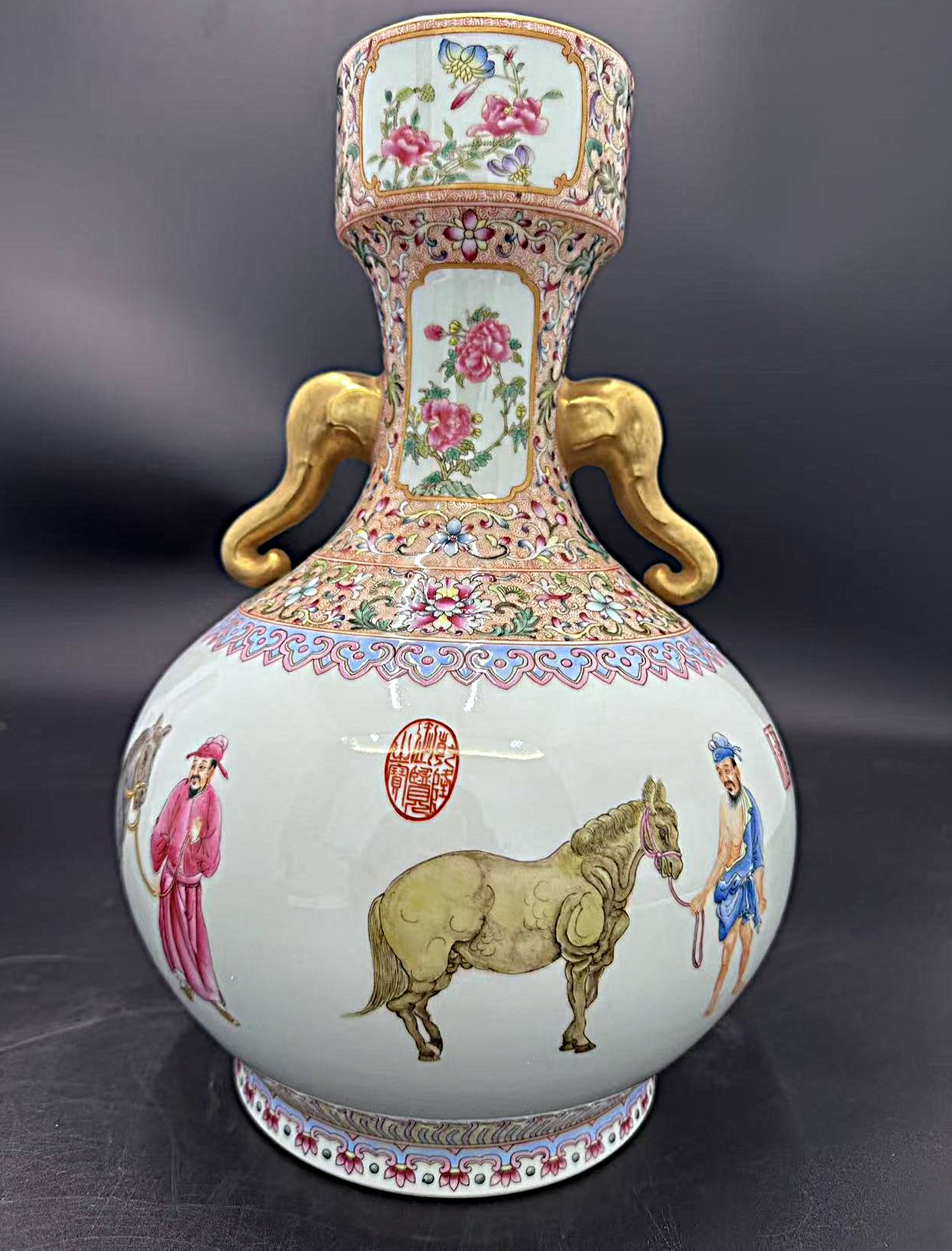 清乾隆时期,国力昌盛,文化艺术蓬勃发展,瓷器制作达到了历史的巅峰。这件缠枝人物粉彩双耳如意瓶正是这一时期制瓷工艺的杰出代表。它不仅体现了当时工匠们对工艺的极致追求,更蕴含着深厚的历史文化底蕴。在乾隆皇帝对艺术的热爱与推崇下,景德镇御窑厂汇聚了众多能工巧匠,他们精心烧制每一件瓷器,力求将最完美的作品呈献给皇室。这件如意瓶便是在这样的背景下诞生的,承载着那个时代的辉煌与荣耀。