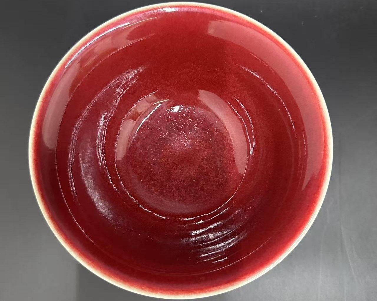 红釉高足碗以铜为呈色剂,经还原焰高温一次烧成。但高温铜红釉对温度、气氛的要求特别敏感,稍有不慎即得不到纯正的红色,因此是最难烧造的颜色釉品种。此宝撇口,弧腹,瘦底,下承以中空高足,下承以中空高足,整体造型大气庄重。