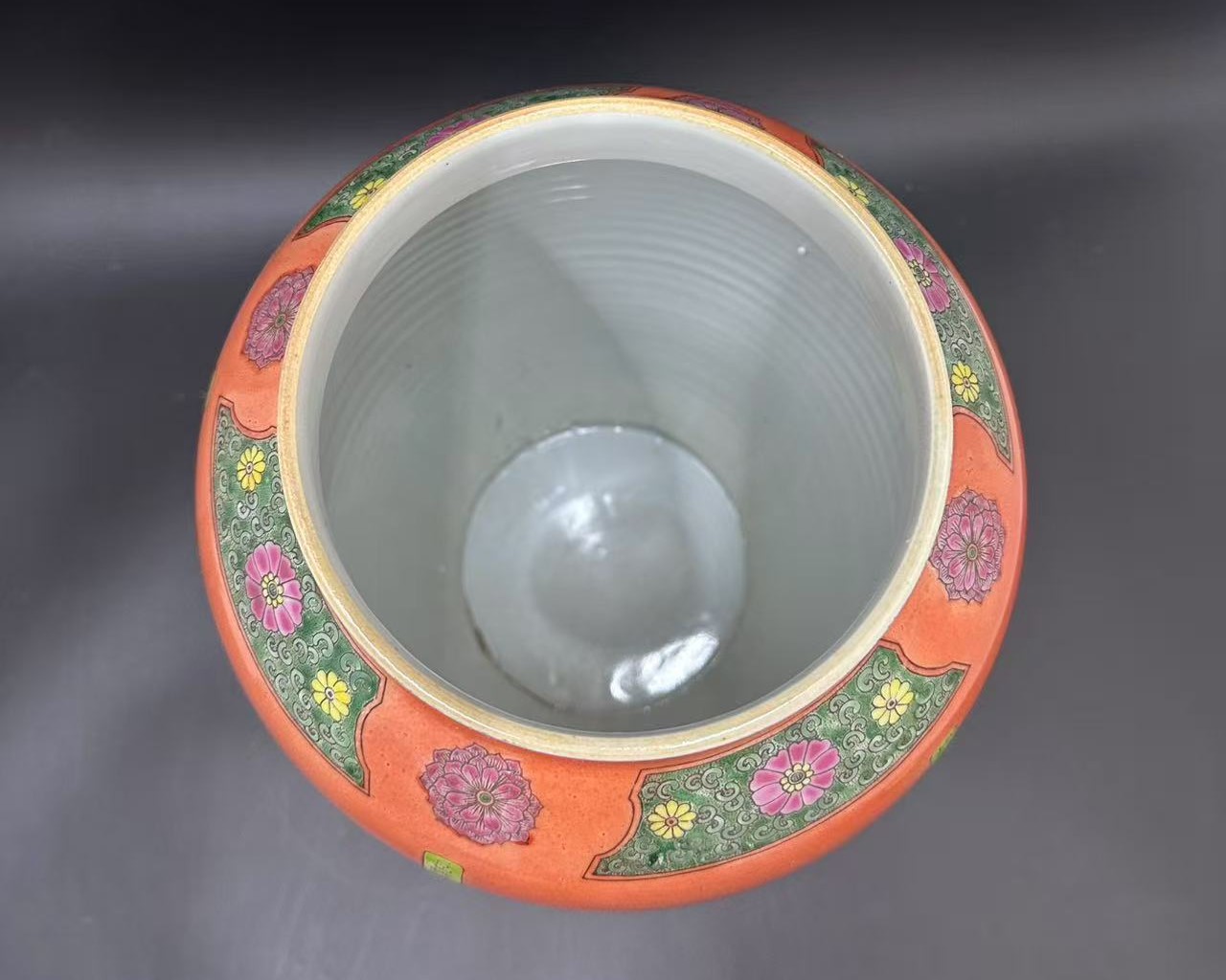 这是一件珊瑚釉人物罐,罐身以鲜艳的珊瑚红釉为底色,其上装饰多彩人物及花卉等图案,底部有“大清康熙年制”款识。整体造型为传统罐式,大口,短颈,丰肩,鼓腹,腹下渐收,底部平稳。线条流畅自然,比例协调,展现出古朴端庄的气质。
