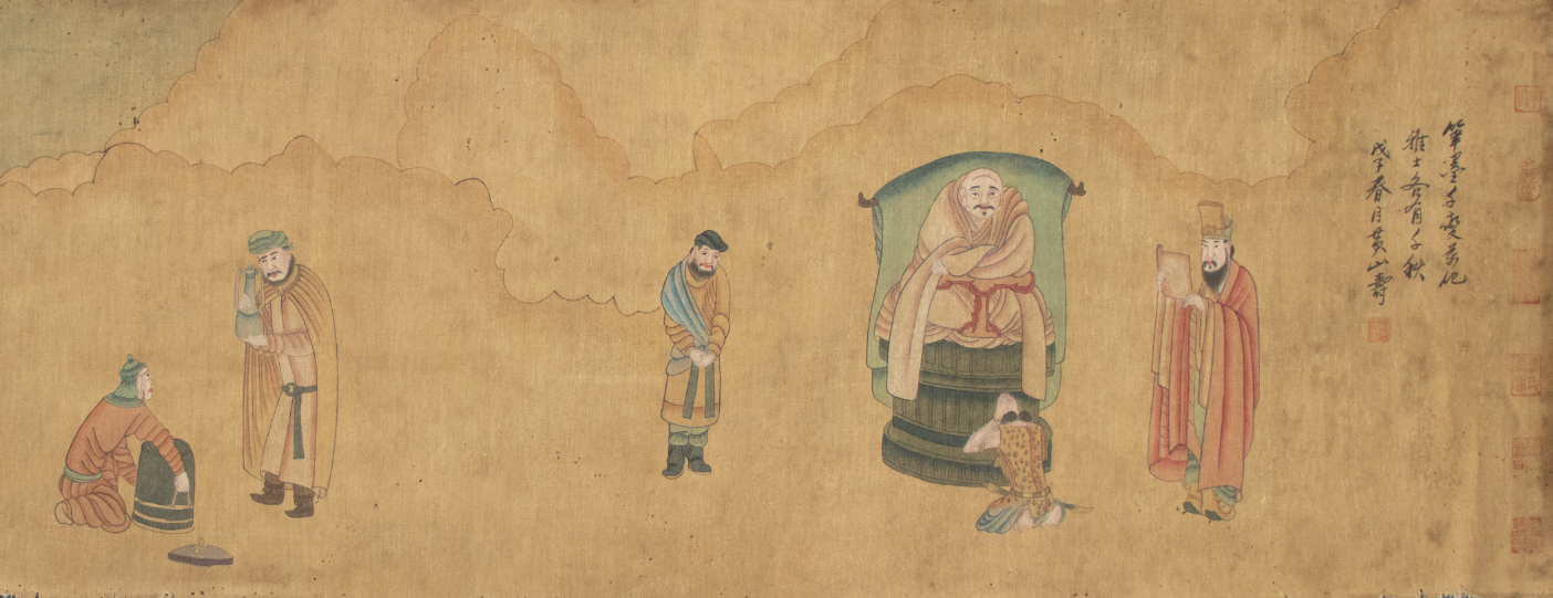 笔墨技法上,黄山寿以“兼工带写”见长:人物衣纹用流畅的兰叶描,线条劲挺而不失柔婉,衣褶层次清晰;设色采用浅绛法,色调清雅温润,衣袍的红、蓝与背景的赭黄、石绿交融和谐,既保留传统设色的雅致,又融入海派绘画的明艳特质;背景山水以写意笔法绘就,云雾晕染朦胧,与工细的人物形成“粗与细”的对比,更显画面层次。