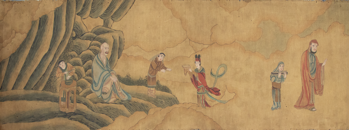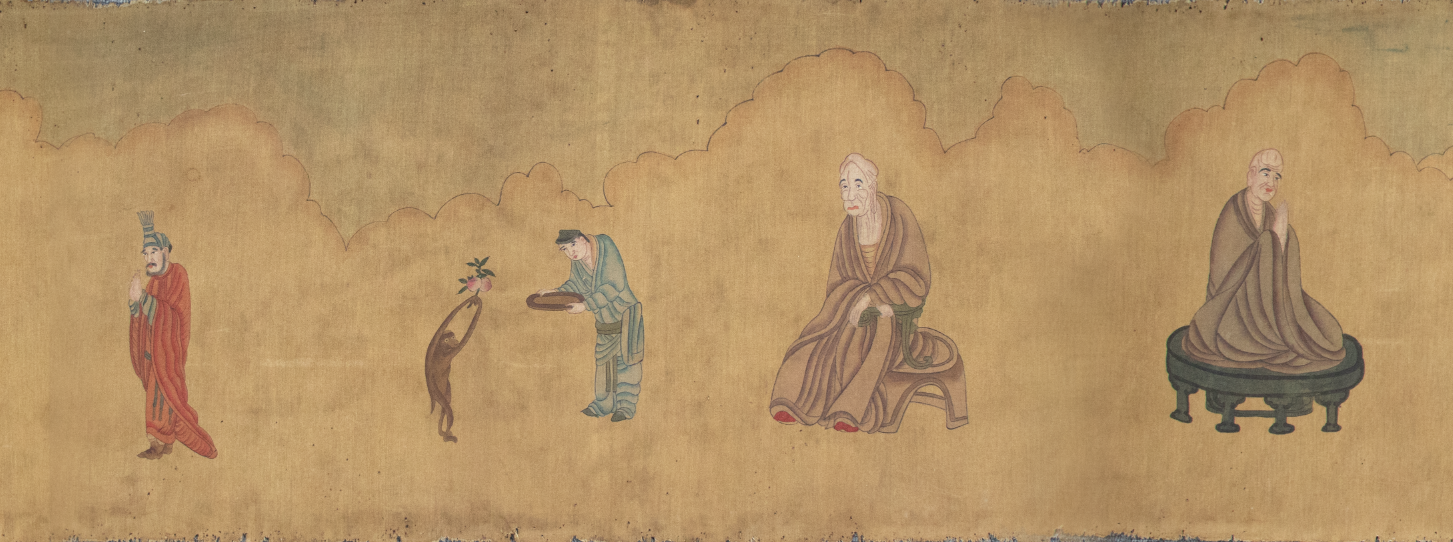 这件黄山寿《罗汉说法图》,是晚清海派绘画的精品之作,兼具“传统题材创新”与“海派笔墨特质”。画面以罗汉说法为核心,铺陈多位罗汉、侍从及瑞兽形象,人物排布疏密有致:主尊罗汉神态沉静肃穆,侍从姿态各异、神情生动,瑞兽(猿、豹)点缀其间,既契合“说法”题材的庄严意涵,又以生活化细节增添灵动感,是传统释道题材与世俗审美融合的体现。