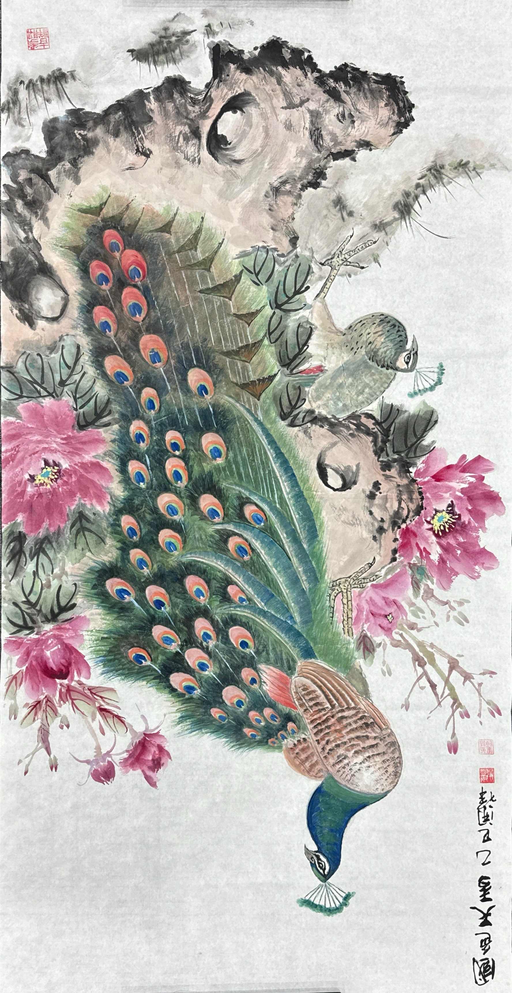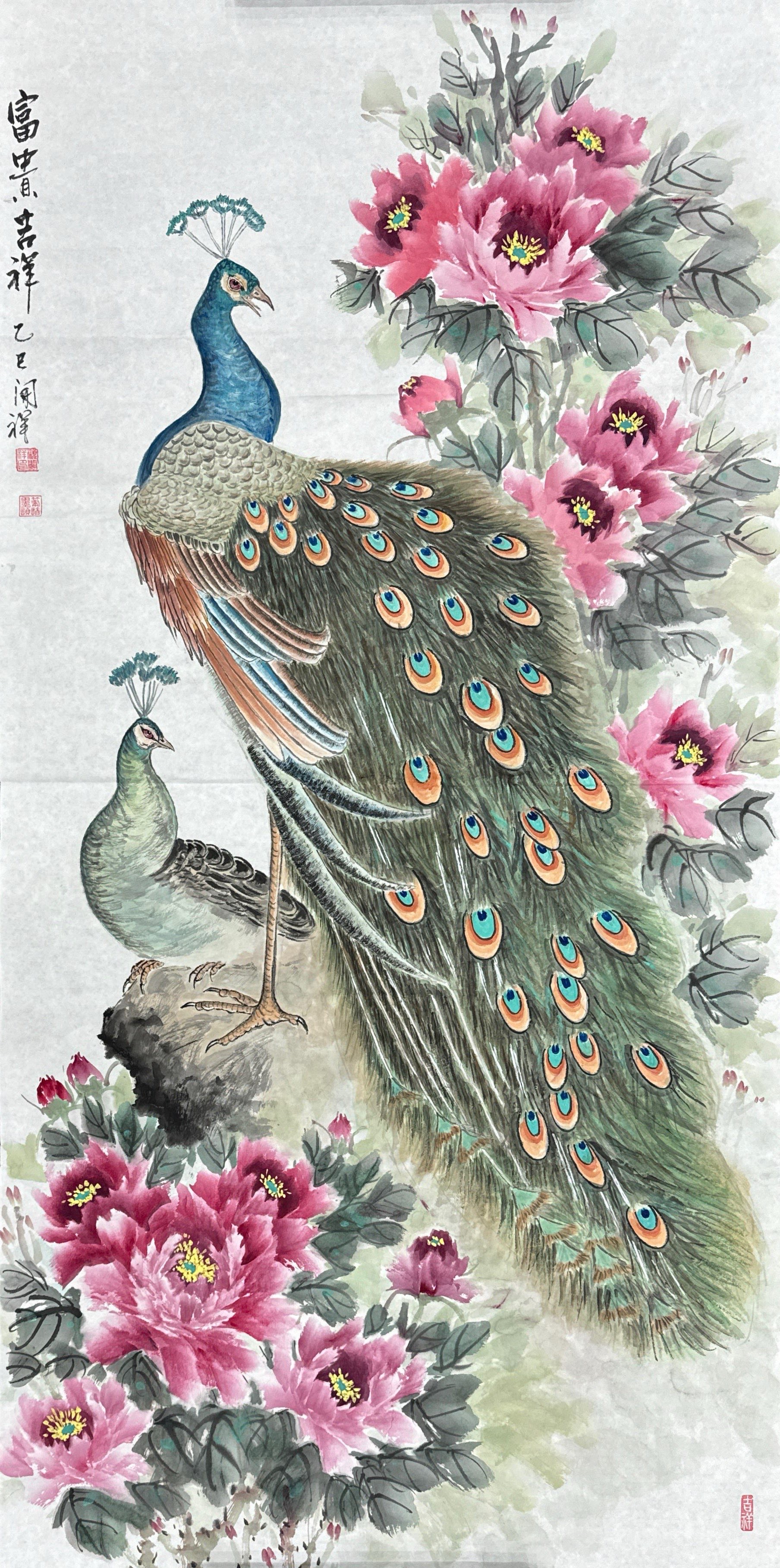 题材上以孔雀配牡丹,暗合“富贵吉祥”的经典寓意,但构图打破传统对称式布局:孔雀或立石、或栖枝,姿态灵动自然,牡丹以簇拥式分布衬显主体,既保留题材的吉祥意涵,又以疏密错落的构图增添现代审美意趣。