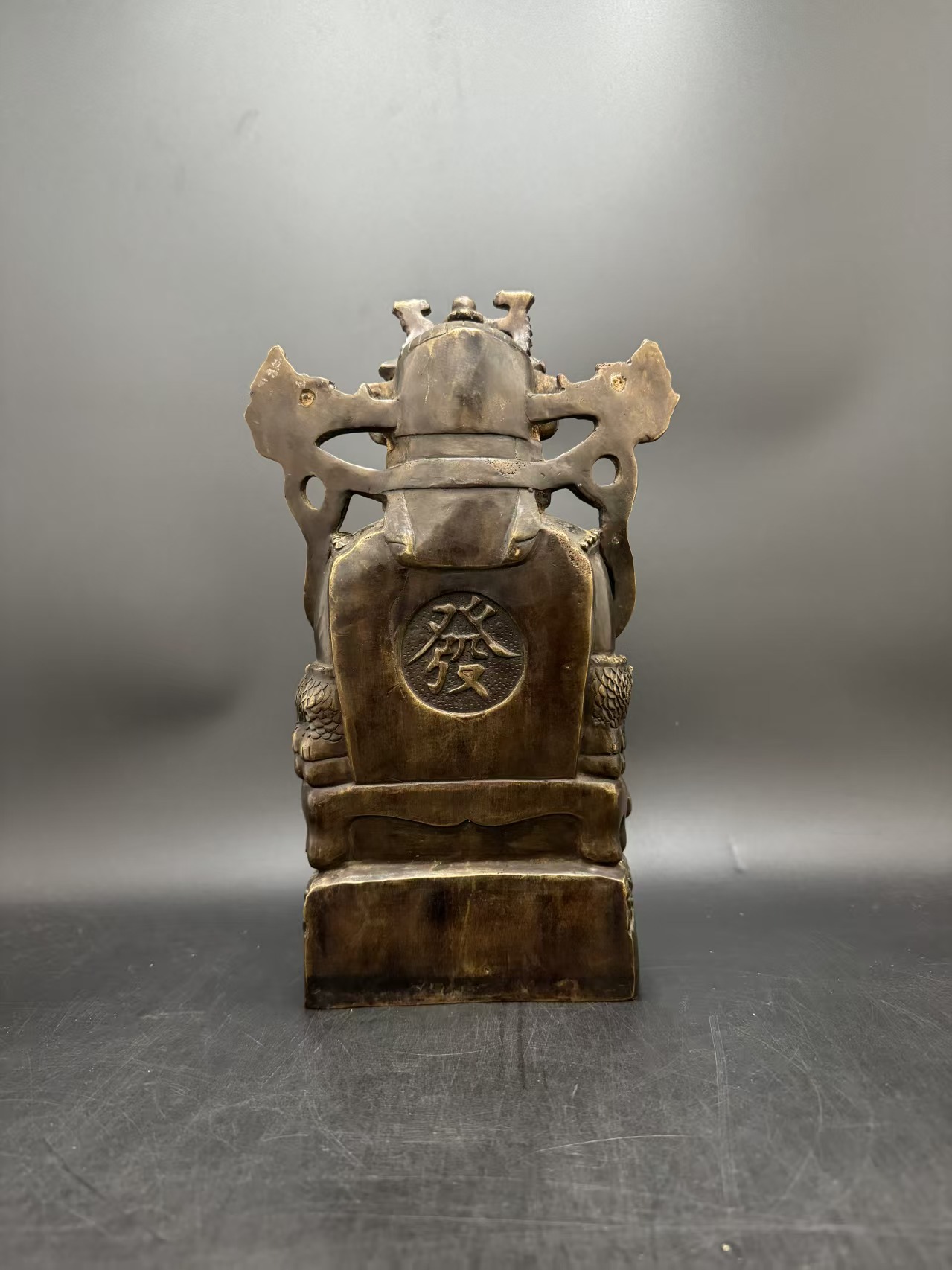 工艺上尽显黄铜造像的精细水准:铜质厚重坚致,色泽呈自然的古铜包浆(无刺眼新铜光泽),雕琢细节丰富且规整——冠饰上的双龙纹灵动生动,手持的宝瓶、如意等法器轮廓清晰,衣纹褶皱层次分明,座底“财星高照”“發”字等纹饰冲压清晰,既体现了铸造工艺的精准性,又通过细节强化了招财纳福的寓意。