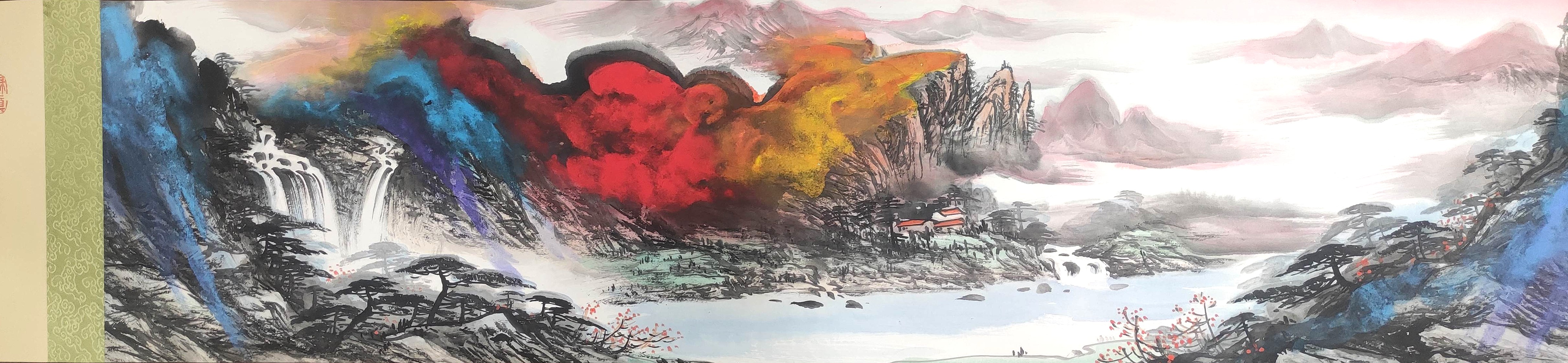 这幅长卷字画融合了传统与创新元素,在继承中国传统书画技法的基础上,进行大胆突破和创新。其独特的色彩运用和富有个性的笔触,形成了何江熊鲜明的艺术风格。具有较高的艺术审美价值和文化内涵。