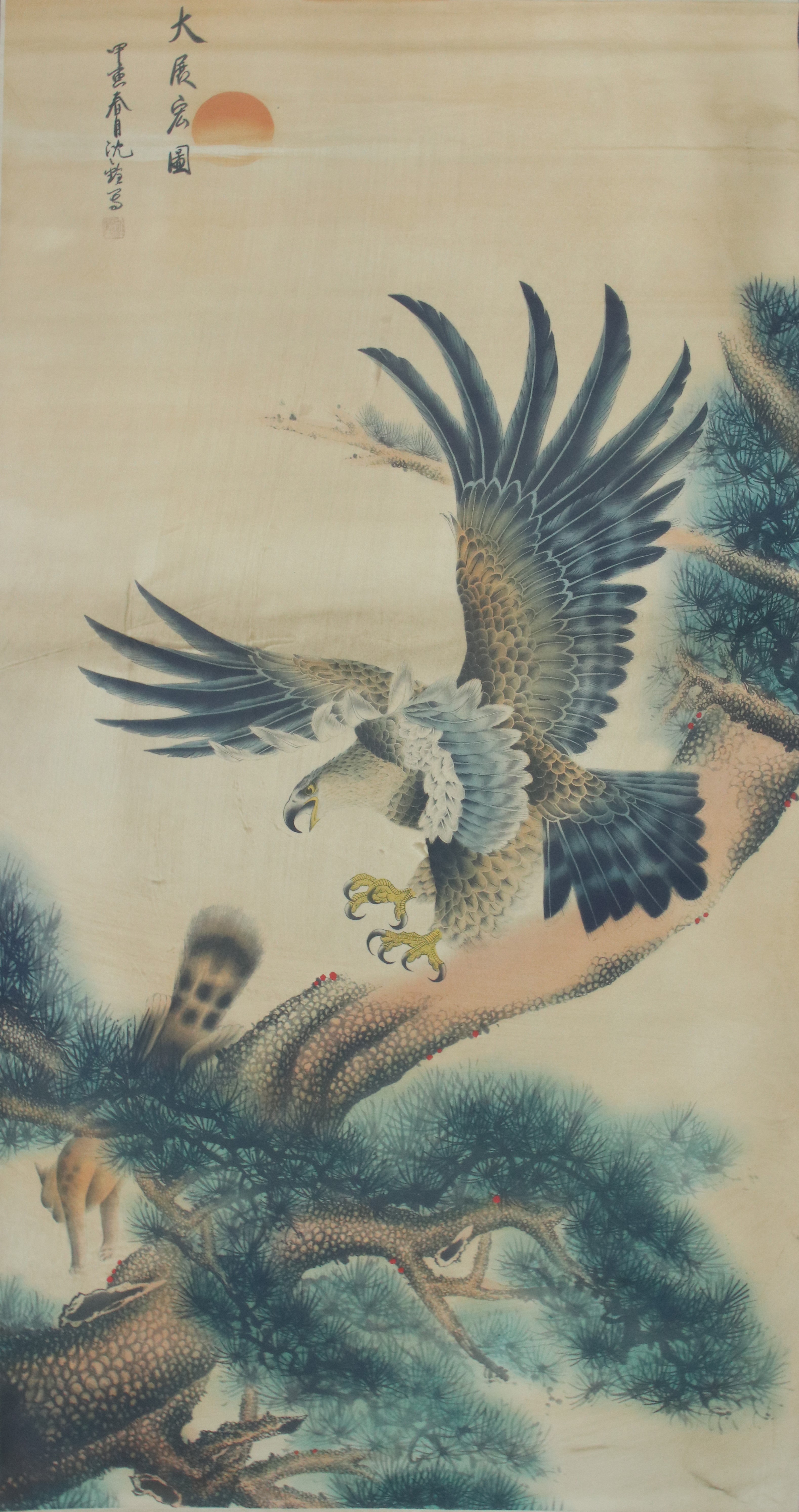 在清代画坛,沈铨以其独特画风留下浓墨重彩的一笔,其《大展宏图》之作更是令人赞叹。画中,雄鹰占据视觉中心,身姿矫健,羽翼舒展,似正欲搏击长空。沈铨以细腻入微的笔触勾勒鹰羽,每一根羽毛都质感鲜明,尽显其精湛技艺。