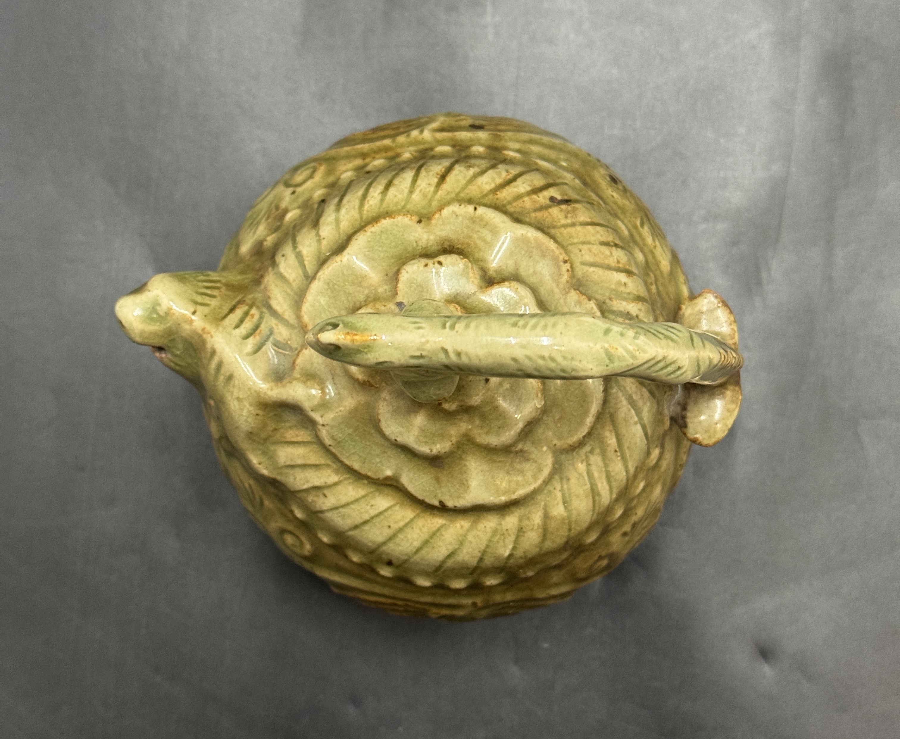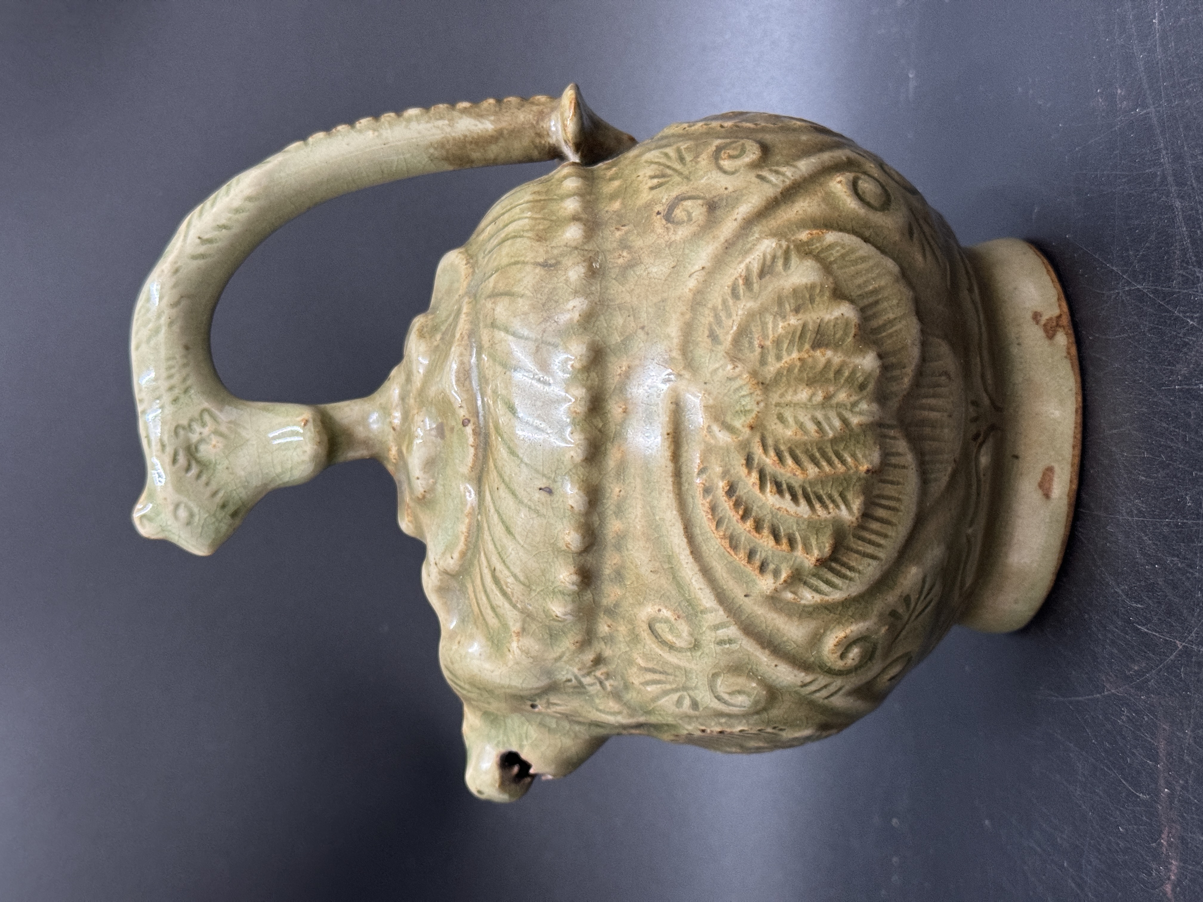 这件三王倒流壶,壶盖与壶身一体成型,造型饱满釉色青润,釉质晶莹闪黄。胎质坚细,纹饰立体。贴塑连珠纹,雕花锯齿,壶身牡丹刻花深邃,线条流畅。造型,釉色,纹饰极贴合耀州窑的核心。