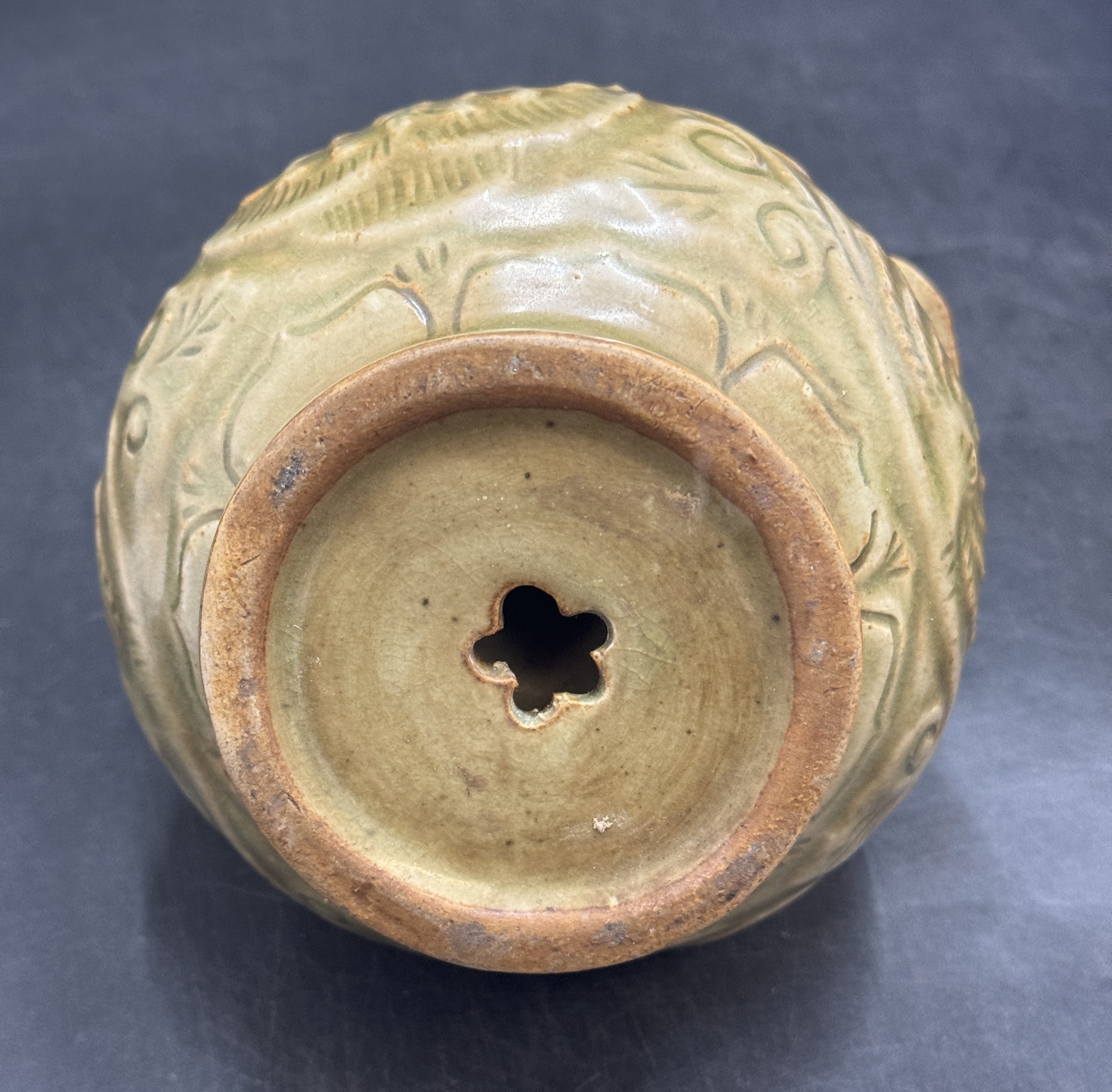 底部梅花孔与内部漏柱结构精密,注液壶倒置,液体从底部流口注入,大气压强原理封闭液体。正置后可从壶嘴正常倒出,既解决了传统壶口易洒漏的问题,又暗含了“机关巧趣”。蕴含“倒即正,正即倒”的哲学思想,警示行事需留有余地,体现了北方青瓷工艺的较高水平。