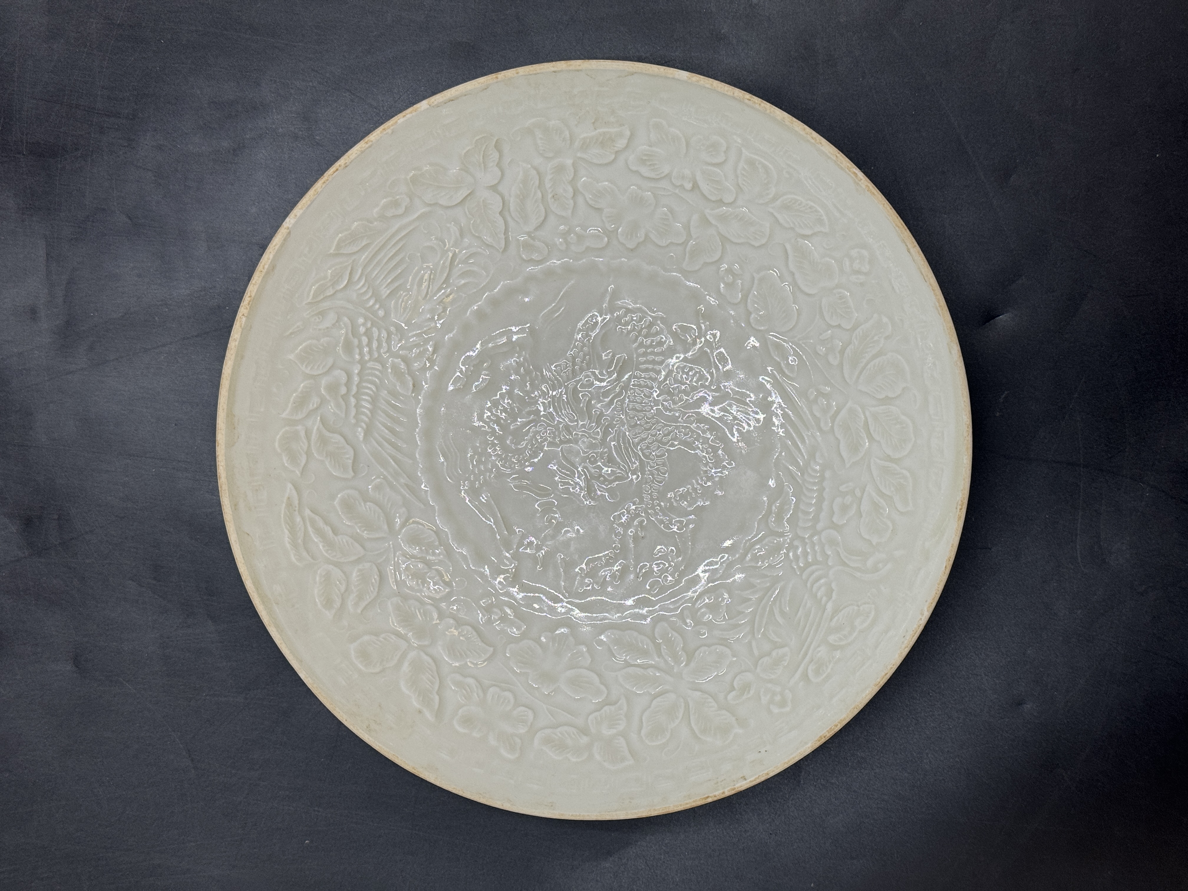 这件藏品是宋代定窑烧造的 “尚食局” 款白釉印花龙纹盘,属宋代宫廷御用瓷遗存,器物口径 21 厘米、高 4.5 厘米,契合北宋晚期至金代定窑盘类的典型规制。